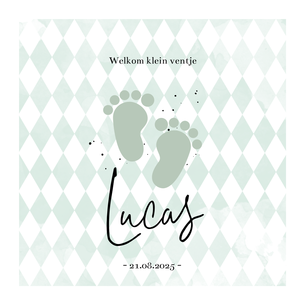 Traditioneel geboortekaartje met voetjes en ruitjes, maar dan met een hippe look. In plaats van blauw wordt er groen gebruikt en een hip lettertype om het voetjes-geboortekaartje in een modern jasje te steken.