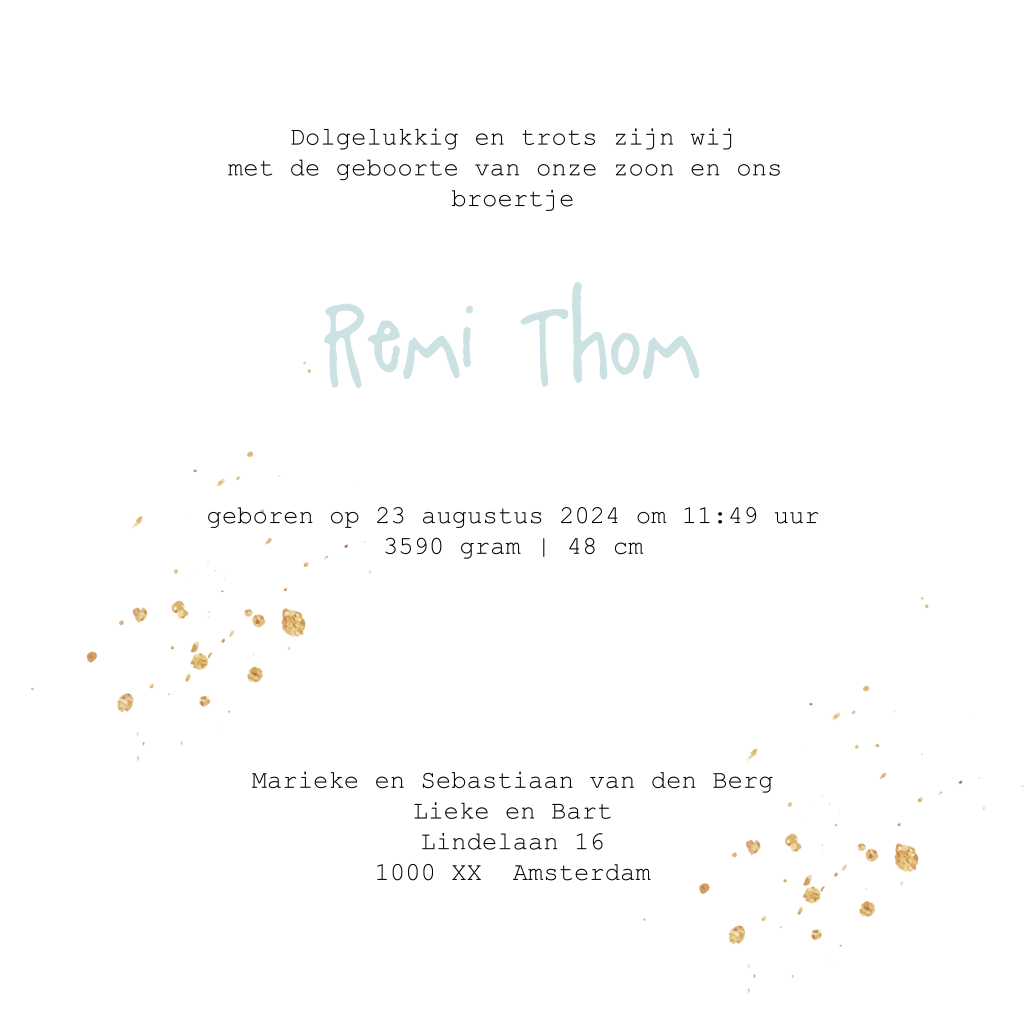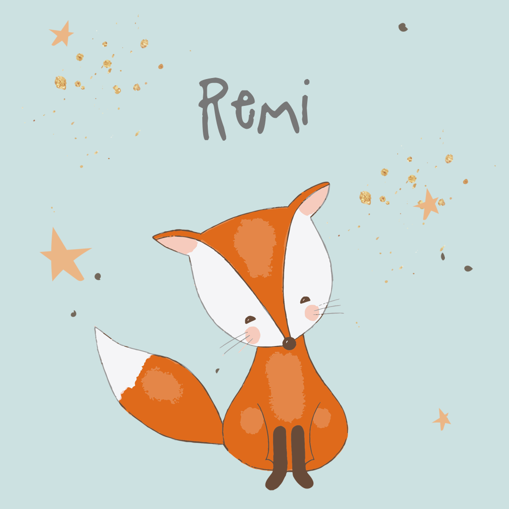 Dieren geboortekaartje voor een jongetje met een blije kleine vos op een lichtblauwe achtergrond. Om het lieve vosje heen dwarrelen sterretjes en verfspetters in een gouden look. In de online editor kan je eenvoudig kleuren aanpassen en zijn er vele andere opties om precies de kaart te ontwerpen die je wilt!