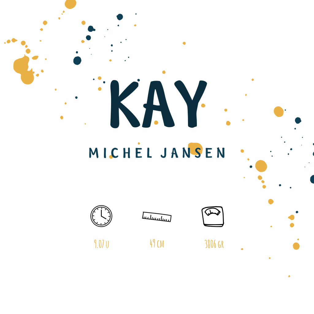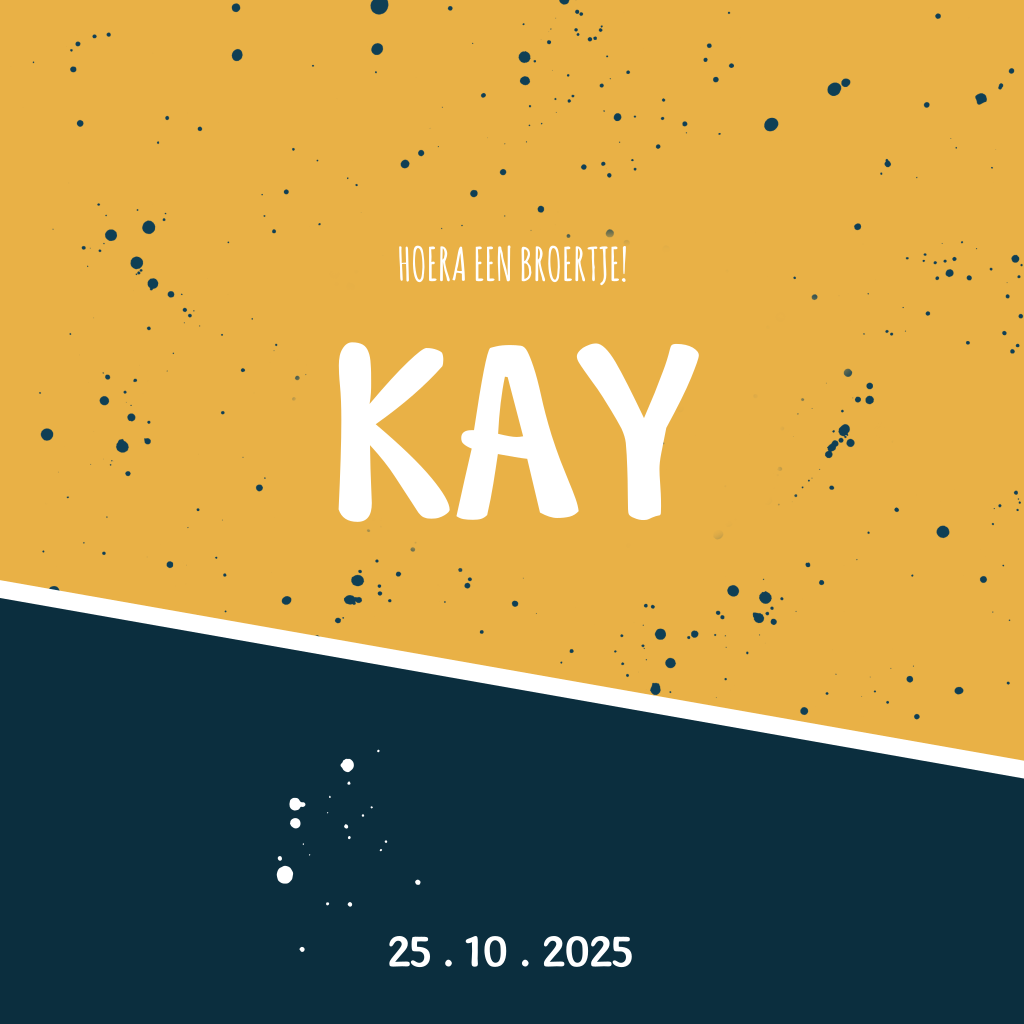 Hip geboortekaartje met verf spetters in okergeel en donkerblauw