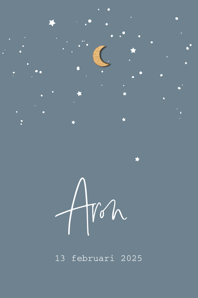 Hip geboortekaartje met houten maan tussen de sterren
