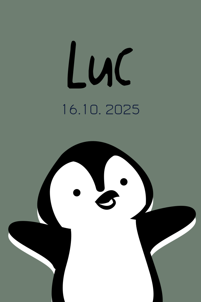 Lief geboortekaartje met stoere groene kleur en vrolijke pinguïn.