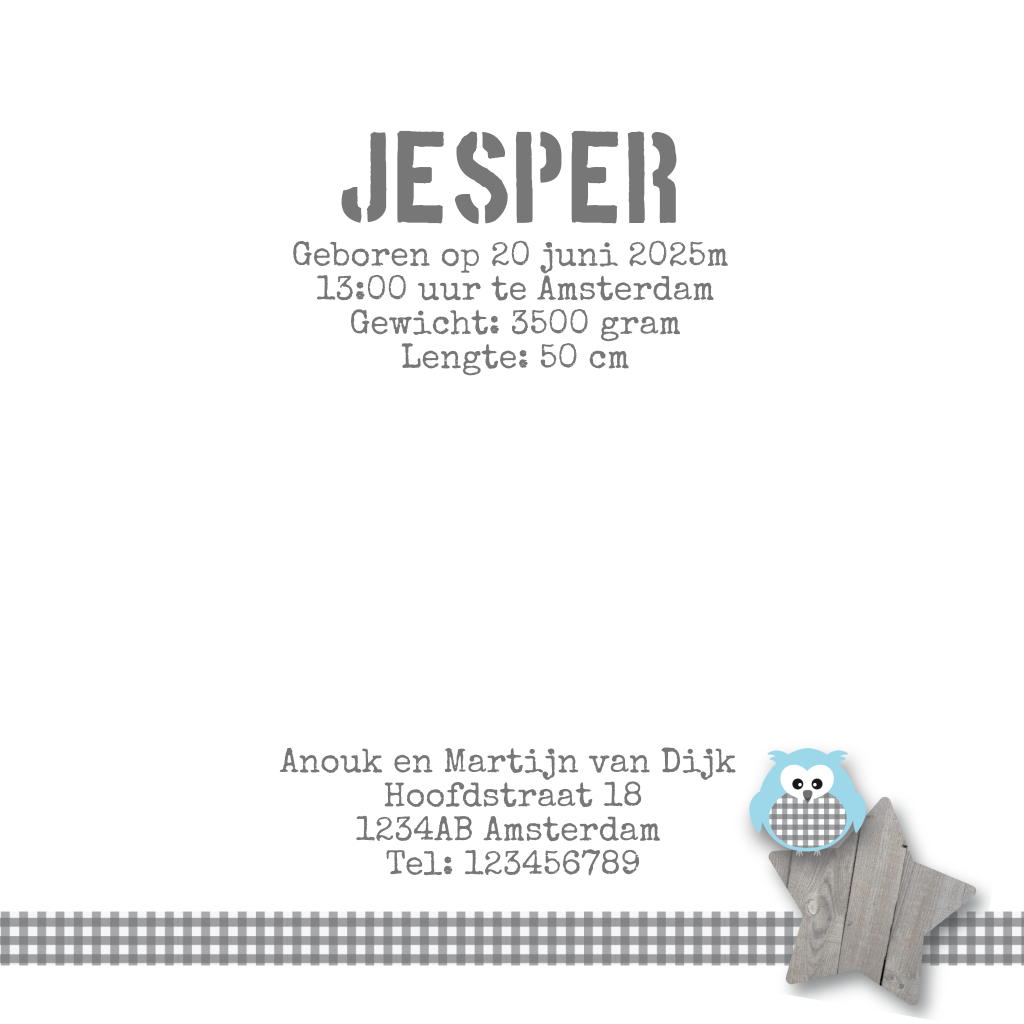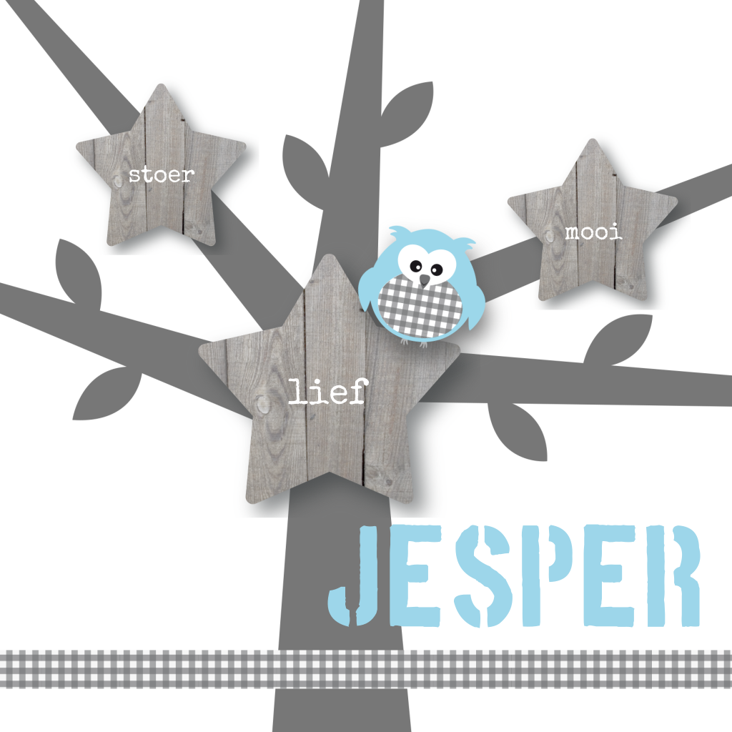 Een hip geboortekaartje met uiltje, boom en sterren met houtprint voor een jongen. Pas zelf de teksten aan.