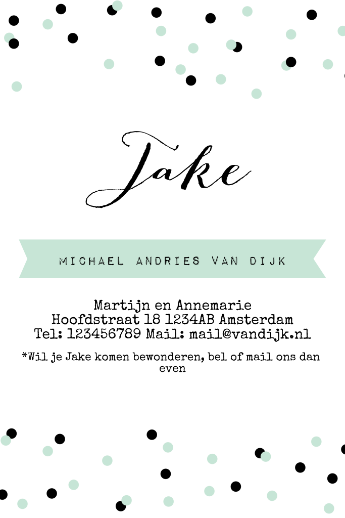 Hip en zacht geboortekaartje met een fotostrip van vier foto's, confetti en banner. Vervang zelf de foto's en pas de tekst aan.