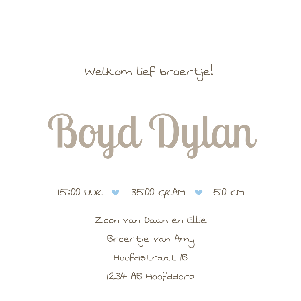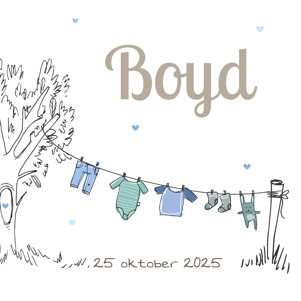 Getekend geboortekaartje met een waslijn in de tuin voor de geboorte van een jongen. Schrijf aan de binnenkant een eigen geboortetekst.
