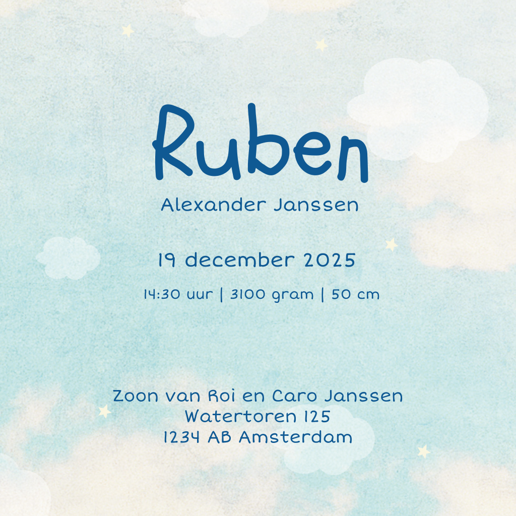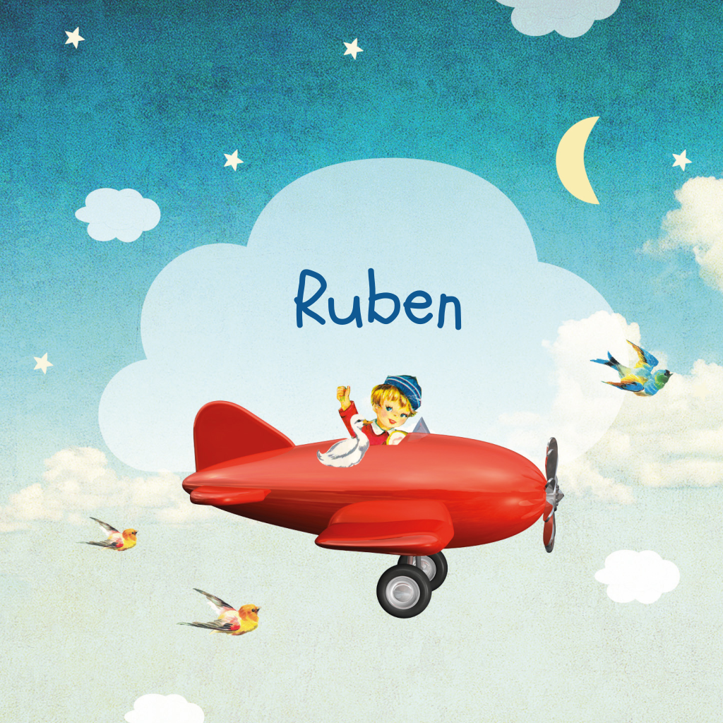 Wat een sprookjesachtige geboortekaart. Het ziet er uit als een uitgebreide poeziëplaatje met een vliegtuig en een jongen. De binnenkant vinden wij ontzettend gaaf!