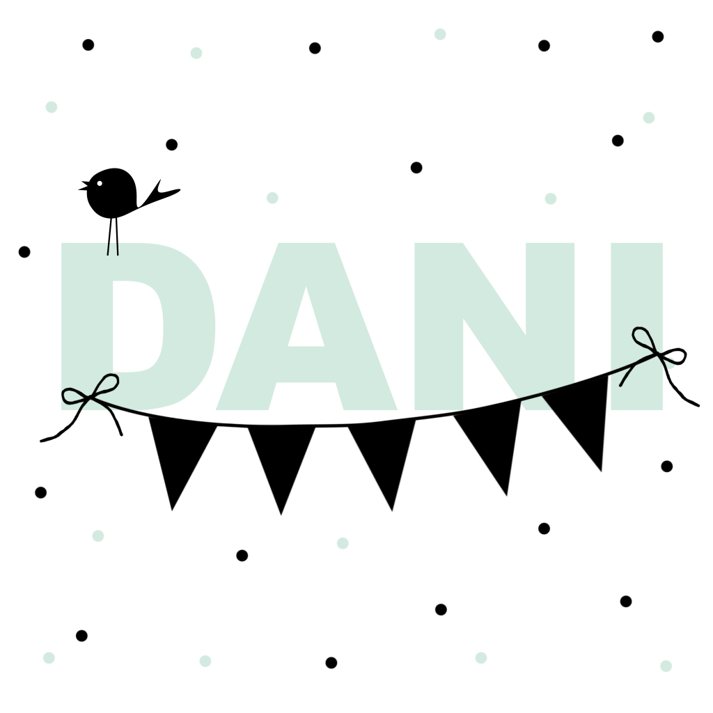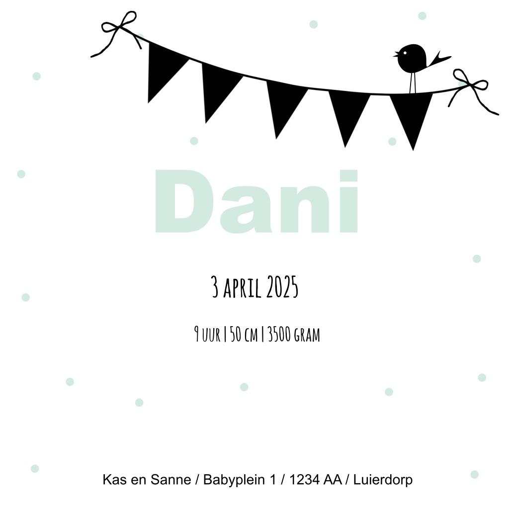 Hip kaartje voor een jongen met zwart-wit, stipjes, mint, vlaggenlijn en vogeltje.