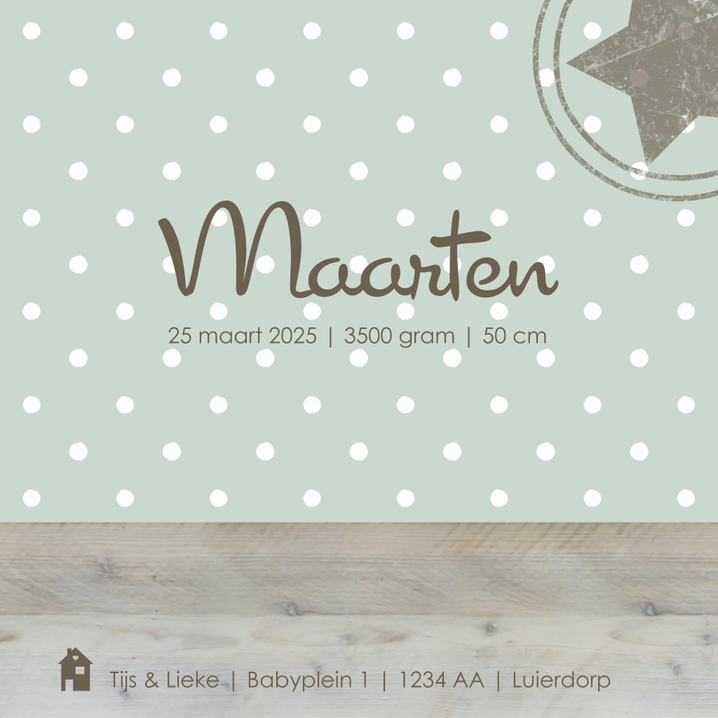 Lief geboortekaartje voor een jongen met pastel groen en hout met stipjes, stempel, hartjes, label en tape.