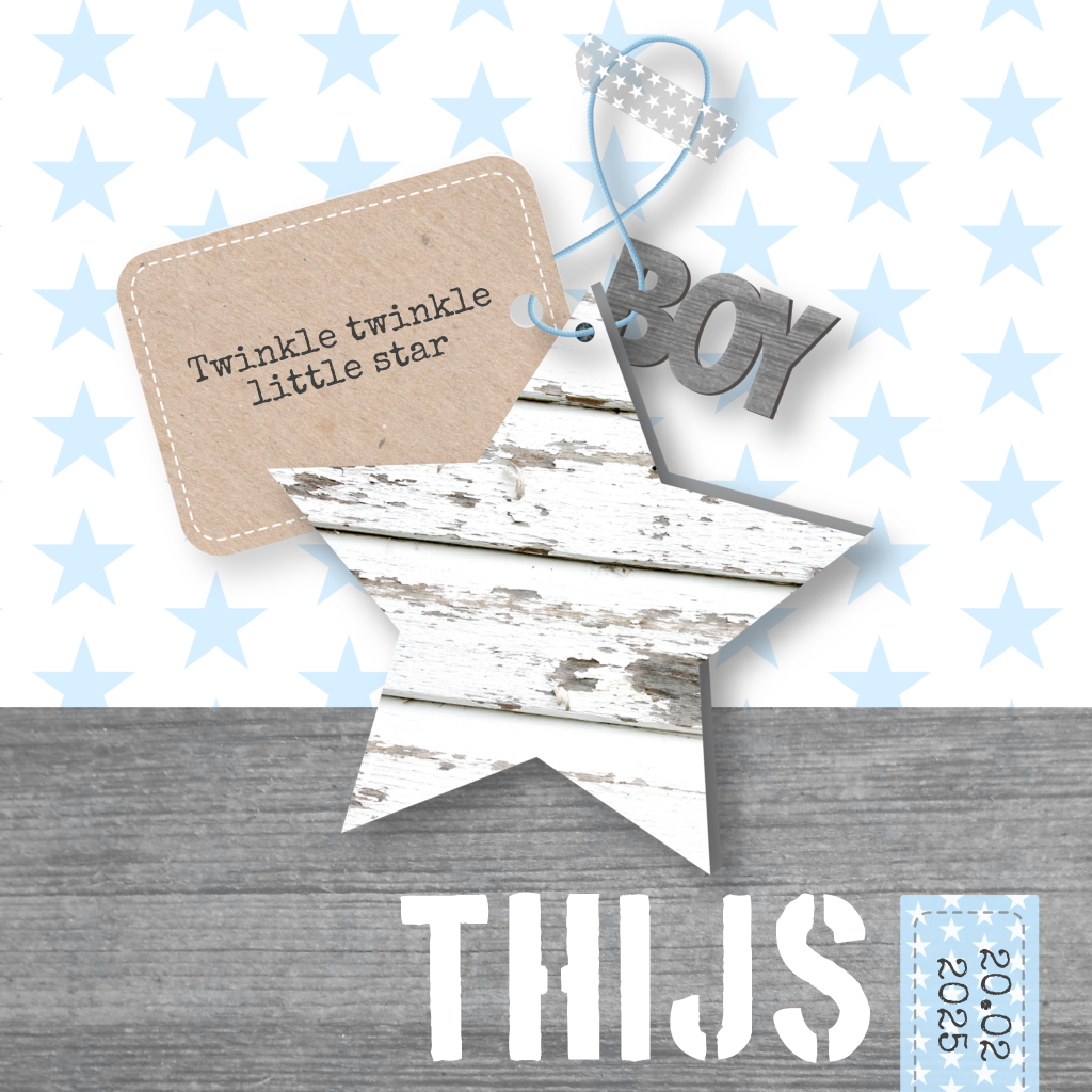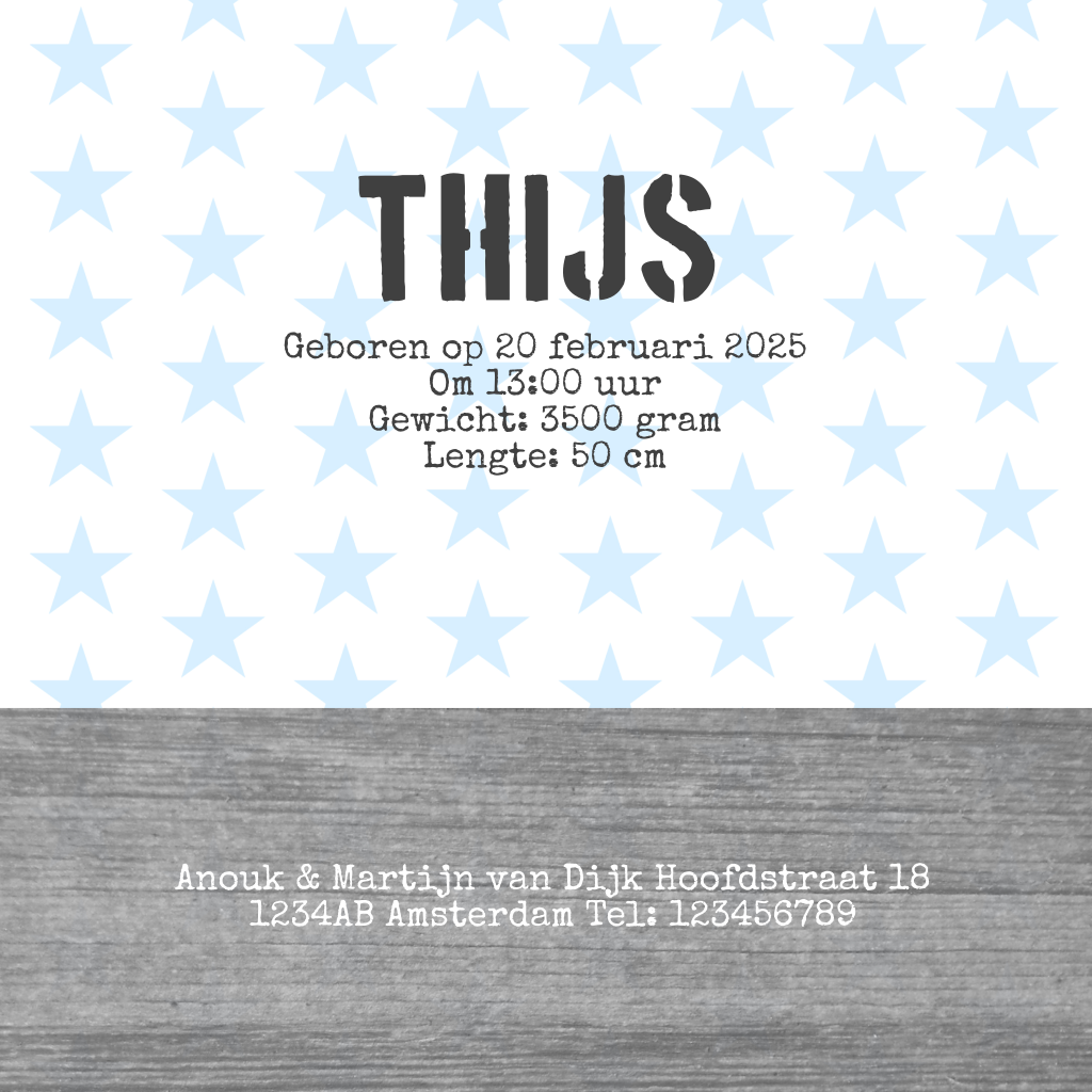 Een stoer geboortekaartje met sterren en houtprint voor een jongetje. De meeste teksten zijn aan te passen.
