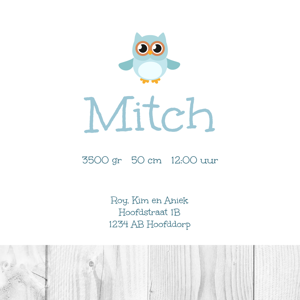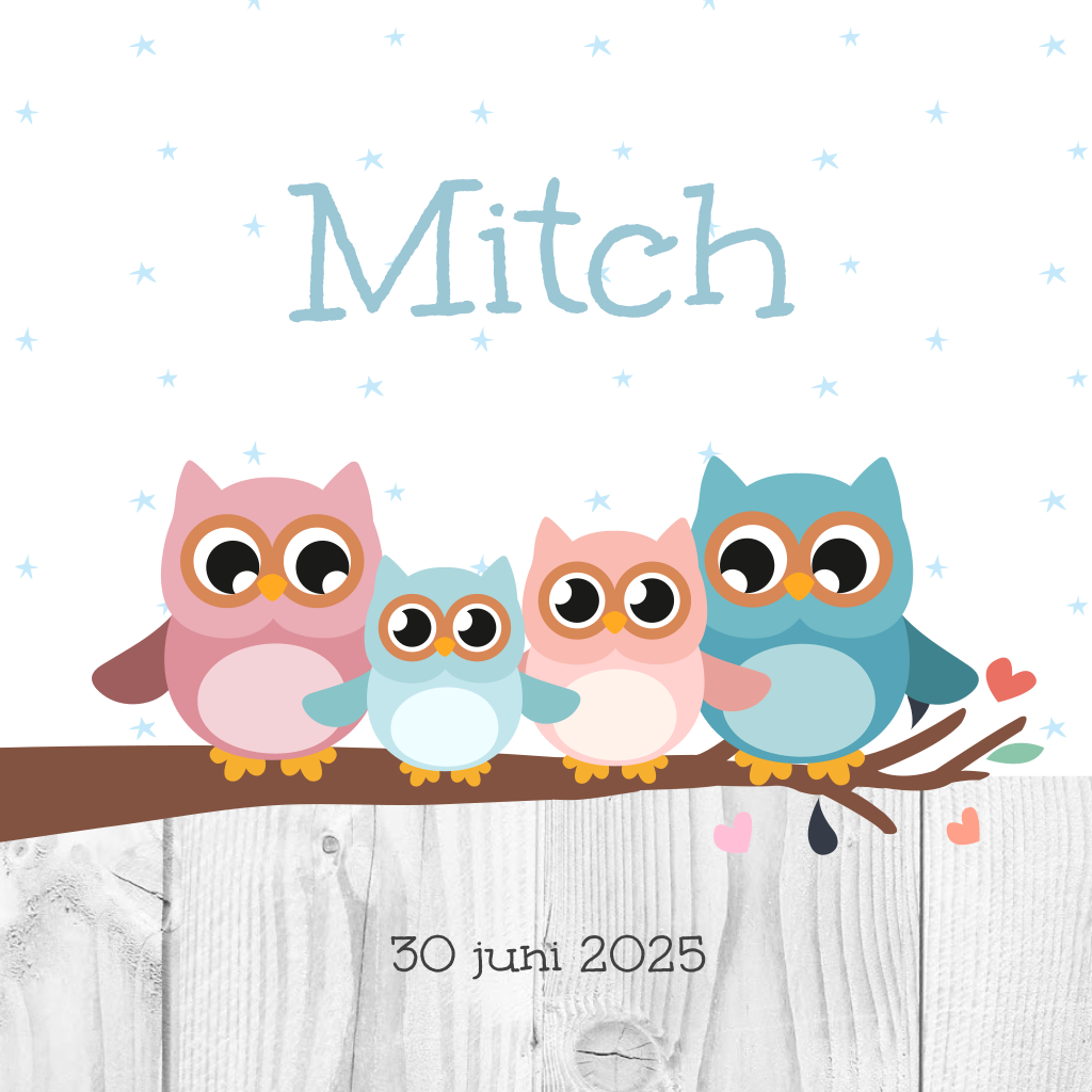 Stoer geboortekaartje broertje om aan iedereen te vertellen dat jullie een lief zoontje en broertje hebben gekregen. De kaart is voorzien van uiltjes, sterren en stoer houtpatroon.