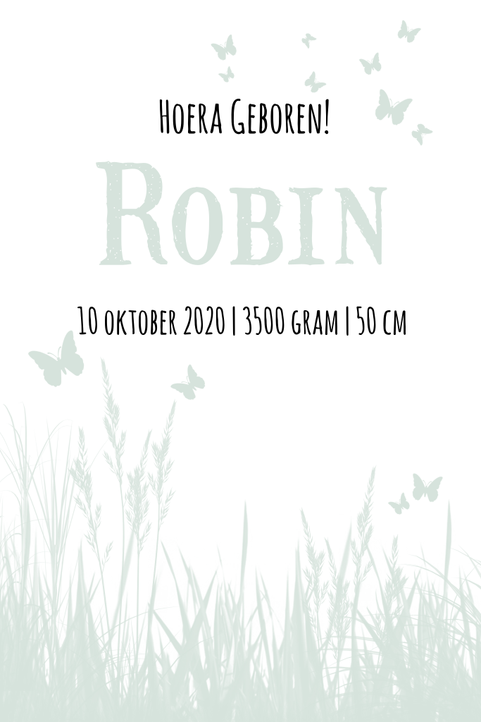 Super trendy staande geboortekaart voor een jongen of meisje met wit, groen, gras en vlinders. Aquarel kaartjes zijn helemaal hip!