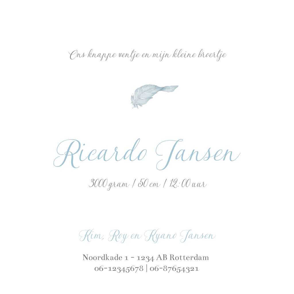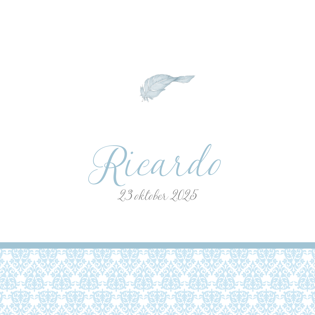 Wat een leuk klassiek geboortekaartje! De barok in combinatie met de getekende veer maken dit kaartje helemaal af. De lichtblauwe envelop past perfect bij dit geboortekaartje.