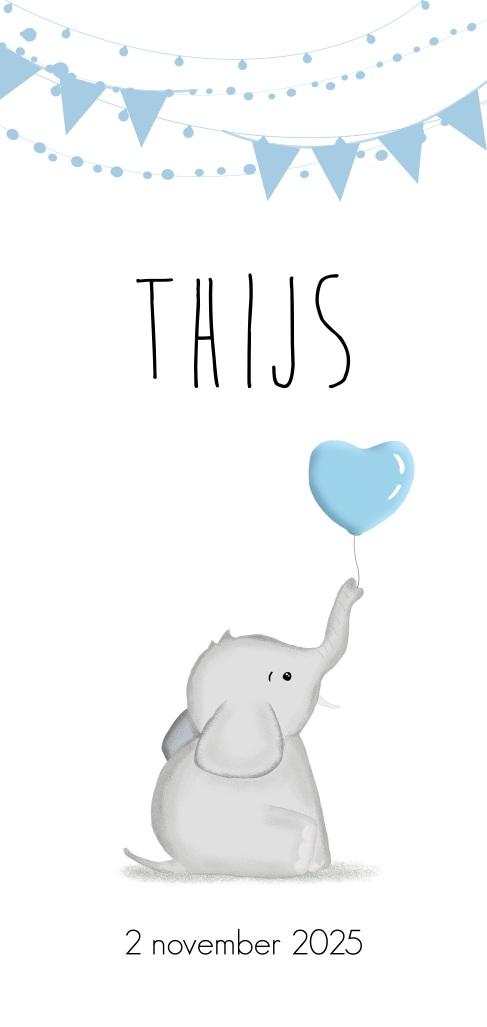 Lief kaartje voor een jongetje. De kleine baby olifant maakt er een groot feest van. Met blauwe slingers en een ballon! Je kan zelf de kleuren aanpassen in de editor.