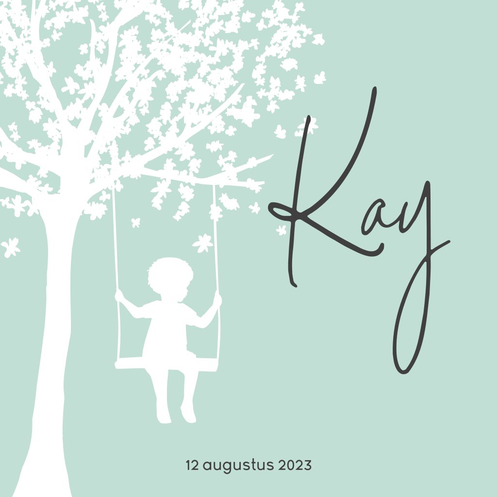 Een hip babykaartje voor je zoon in mintgroen. In dit design is gewerkt met silhouet van het jongetje op een schommel aan een boom. Hoe lief!