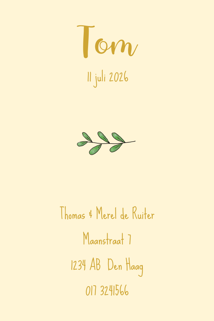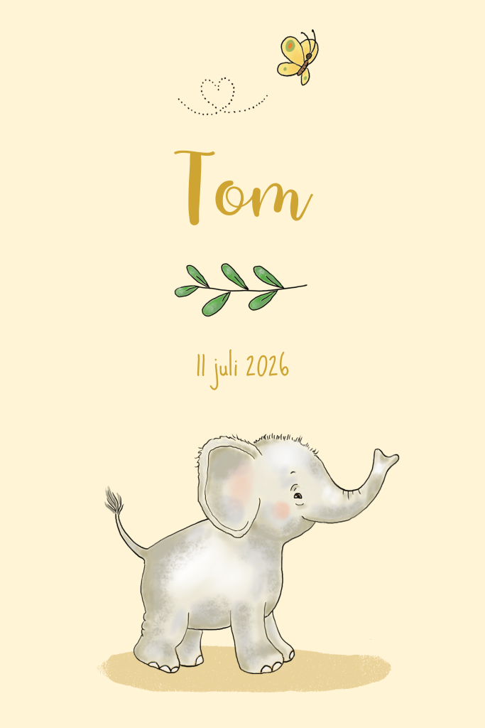 En lief getekend geboortekaartje met olifantje en vlinder voor een jongen op een zachtgele achtergrond.