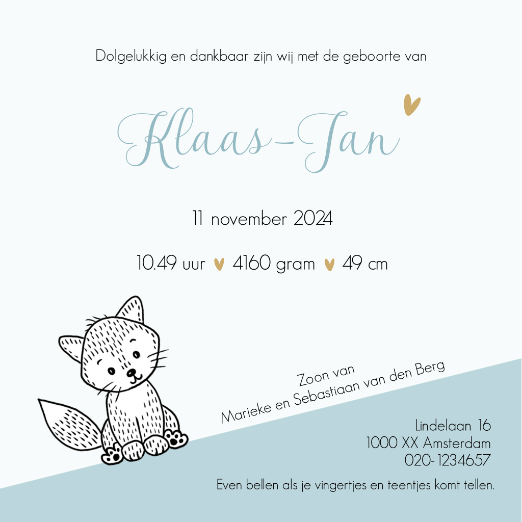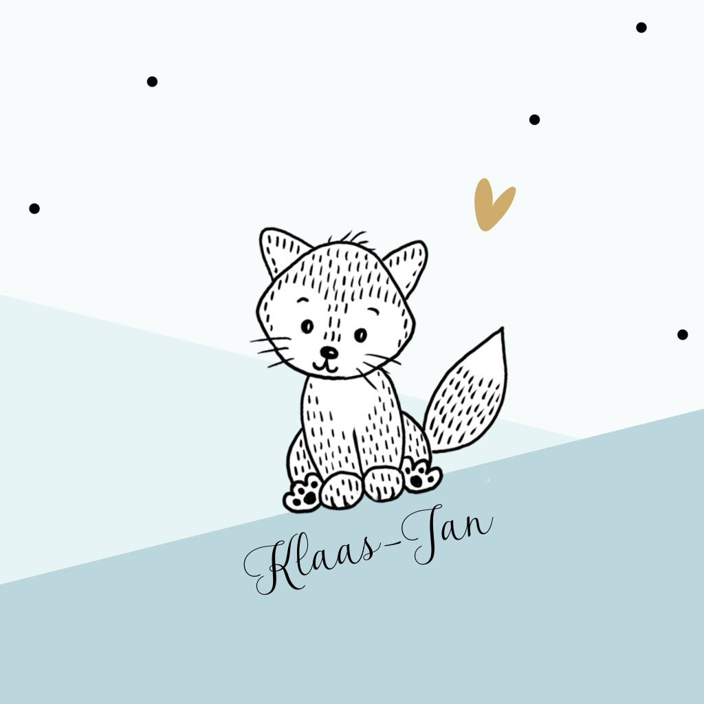 Lief geboortekaartje met vosje in zwart wit en blauwe kleur vlakken