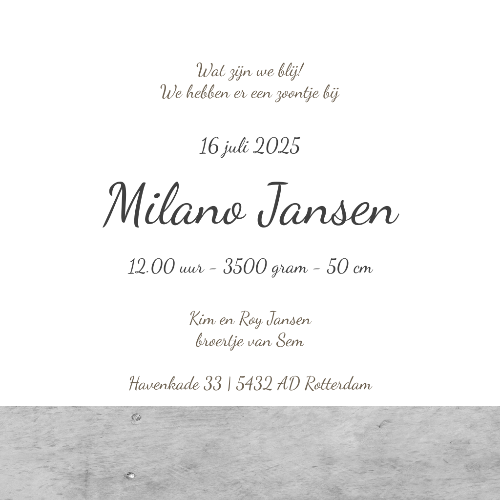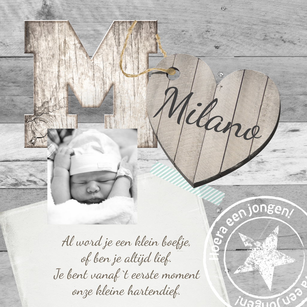 Origineel scrapbook geboortekaartje met stempel, houten hart, een memoblaadje, tape een foto en iets heel leuks: de eerste letter van de naam van jouw jongetje. Echt uniek! Zo pas je de letter aan: Kijk bij 'afbeeldingen' naar 'letters - hout' en kies de letter die jij wilt. Kom je er niet uit? Laat de naam van je kind weten en wij helpen je verder.