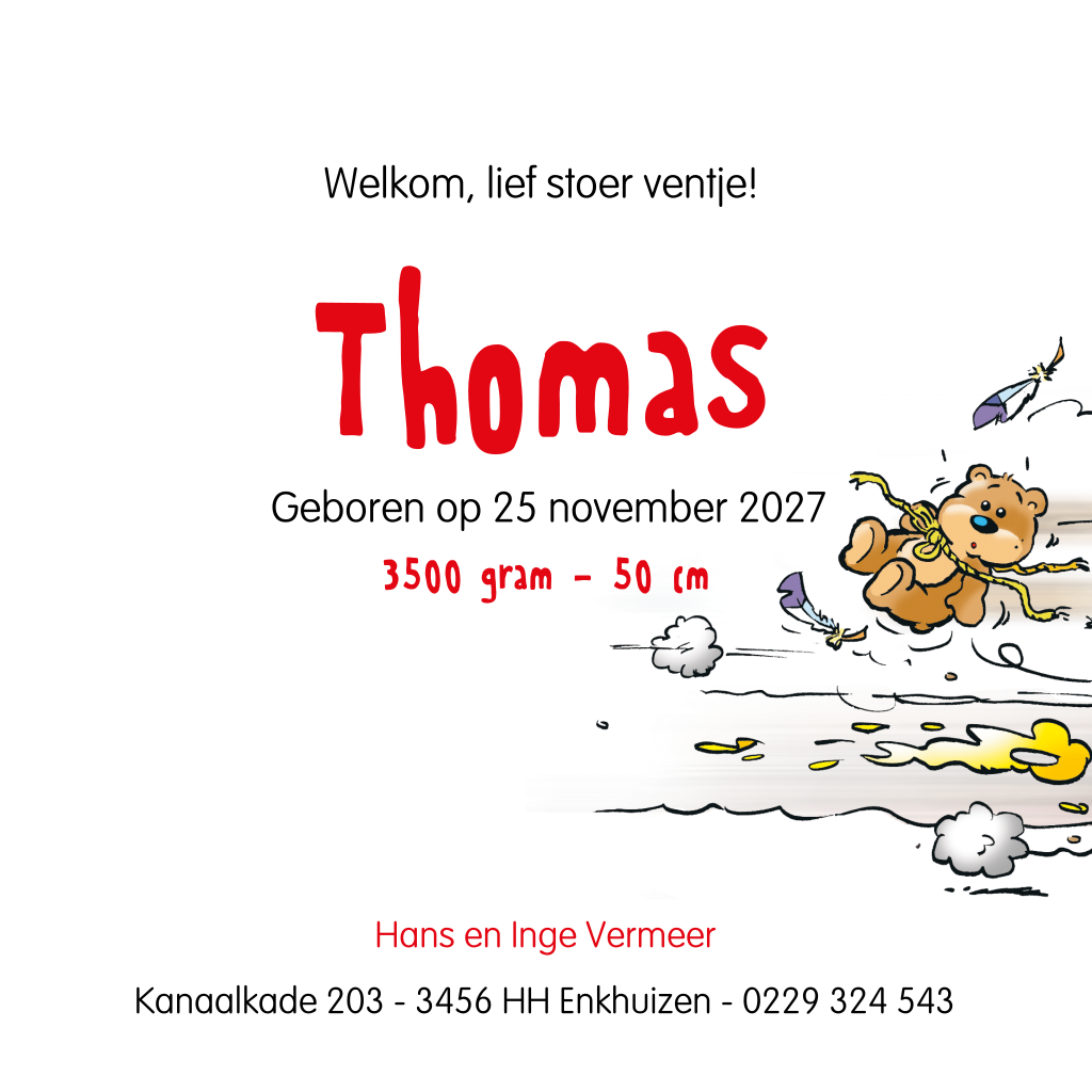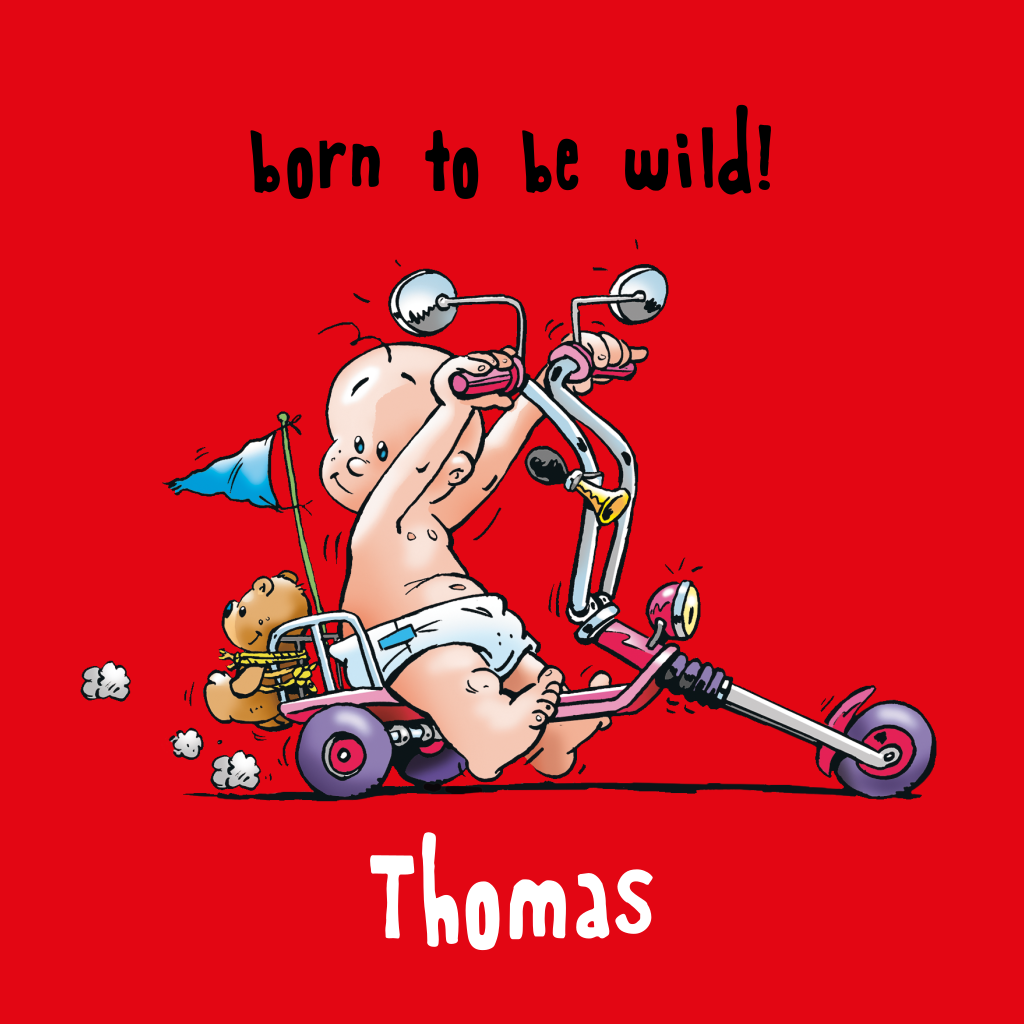 Een baby op een driewielerscooter, wat stoer! Dit illustratieve geboortekaartje met cartoons is ontworpen door Belarto en is leuk voor een jongen. De rode kleur kun je eventueel nog aanpassen naar een andere kleur.