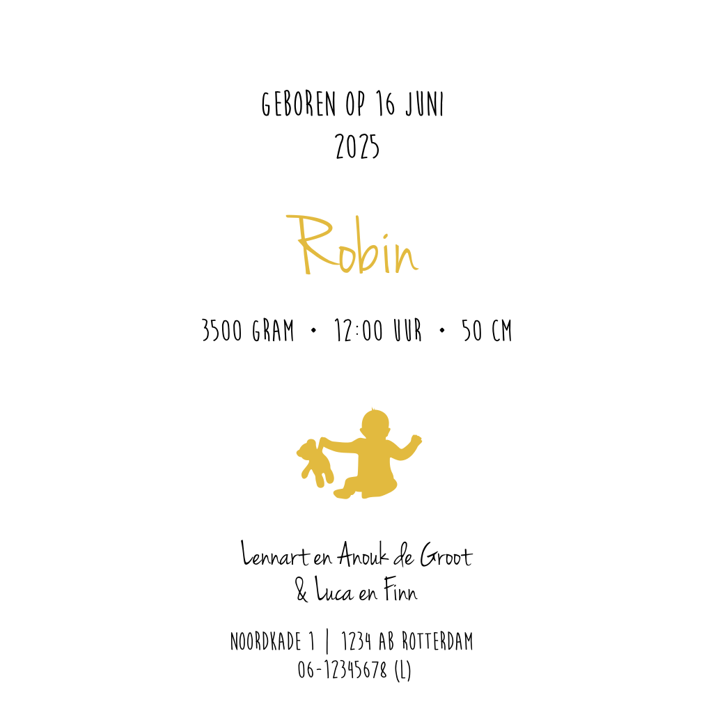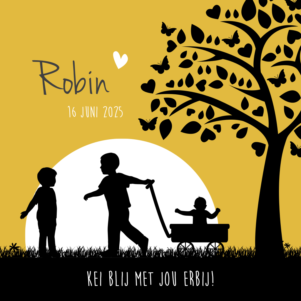 Leuk voor een jongen of een meisje is dit trendy, okergele babykaartje met twee kinderen en een baby bij zonsondergang. Silhouetten zijn helemaal hip! Je kunt hem persoonlijk maken door teksten aan te passen en te kiezen uit één van onze enveloppen en sluitzegels.