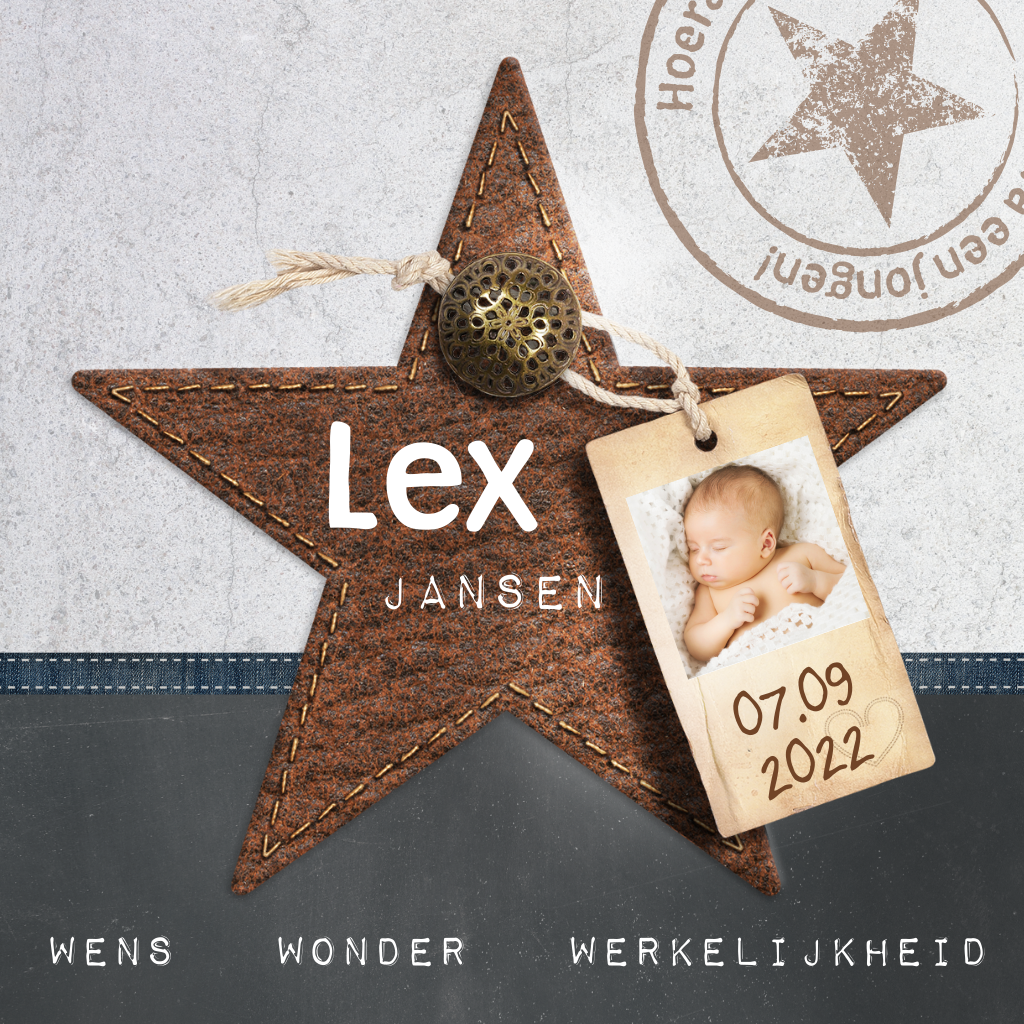 Een heerlijk stoer geboortekaartje met verschillende structuren zoals leer, marmer en jeans. De foto en de geboortedatum staan op een label. De tekst kan makkelijk in de editor aangepast worden.