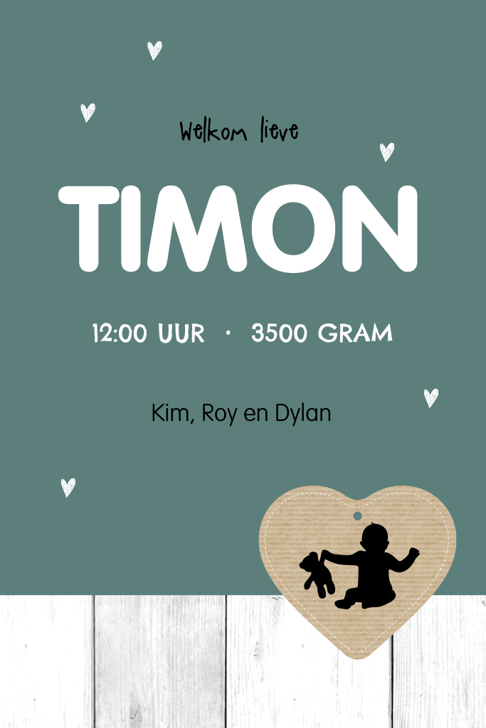 Stoer geboortekaartje broertje met sterren en diep groene nacht. Er staat een hart van kraft op de voorkant met daarop een silhouet van 2 broertjes.