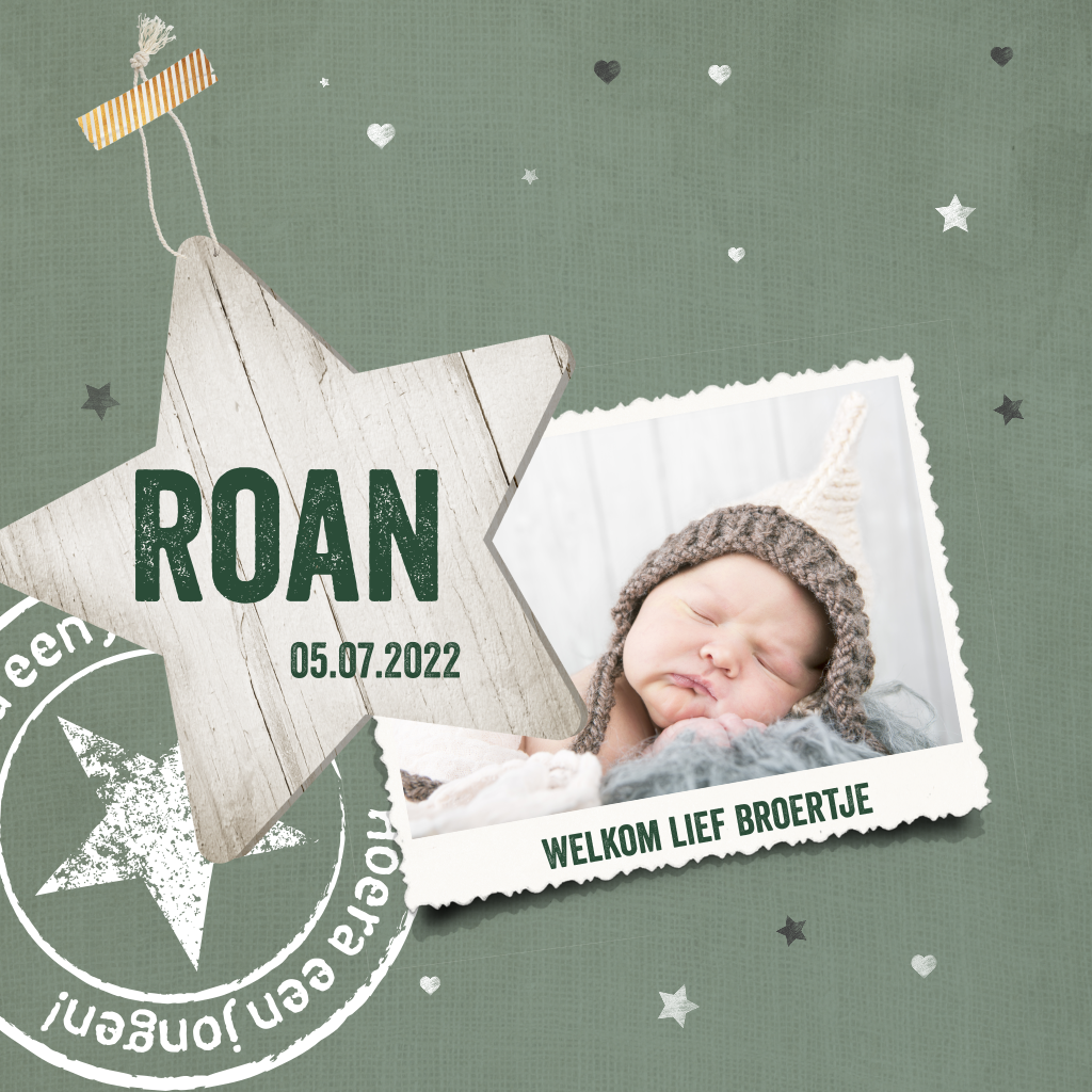 Een stoer kaartje voor de geboorte van een jongen met label, stempel en een foto van jullie kleine vent. Pas de foto en de tekst aan in de editor.