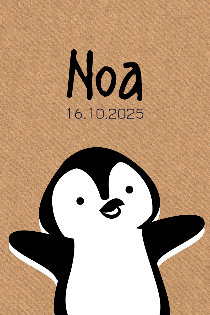 Stoer geboortekaartje met pinguin op kraftachtergrond