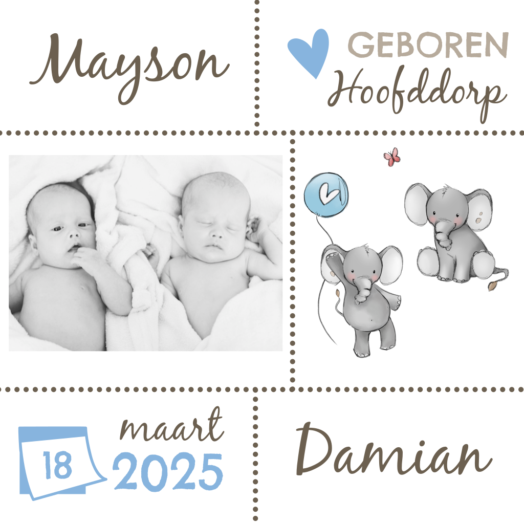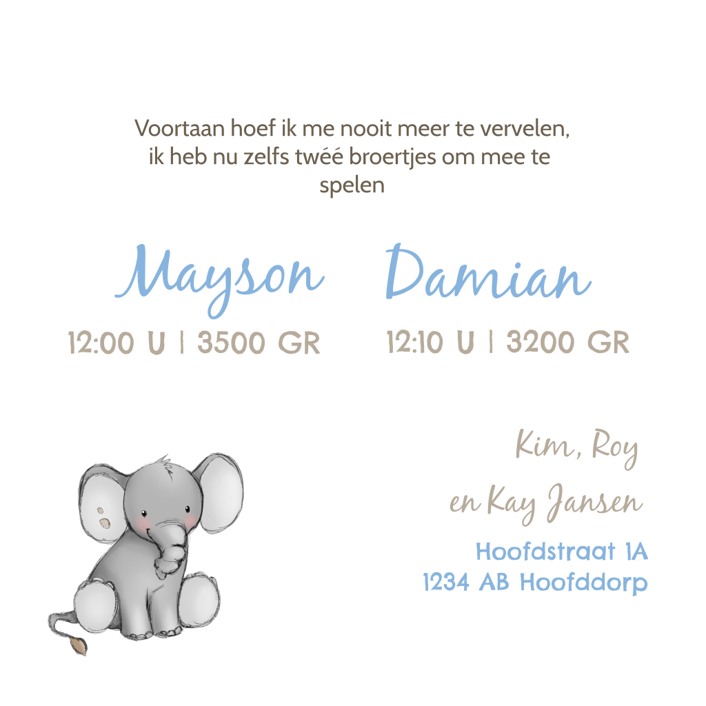 Lief geboortekaartje voor een eeneiige jongenstweeling of tweeiige jongenstweeling. Dit kaartje heeft een olifantenthema. Vervang de voorbeeldgegevens om er jullie eigen unieke geboortekaartje van te maken.