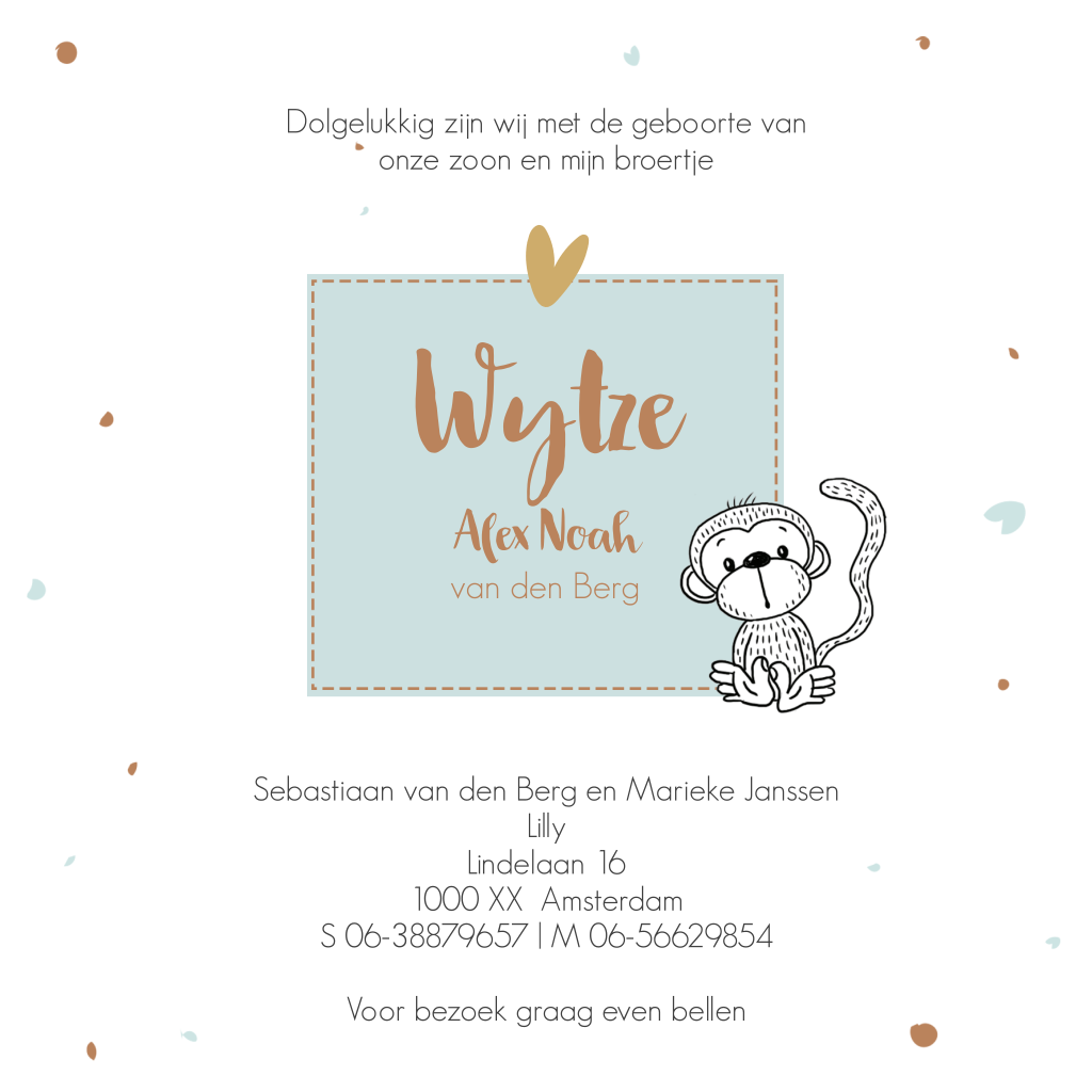 Lief geboortekaartje voor een jongen met zwart wit junglediertjes. Deze kaart kan in de editor makkelijk aangepast worden.
