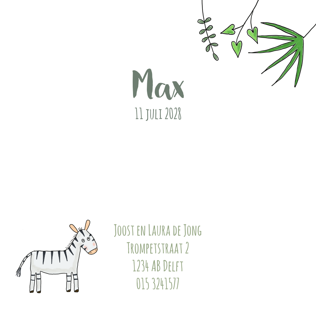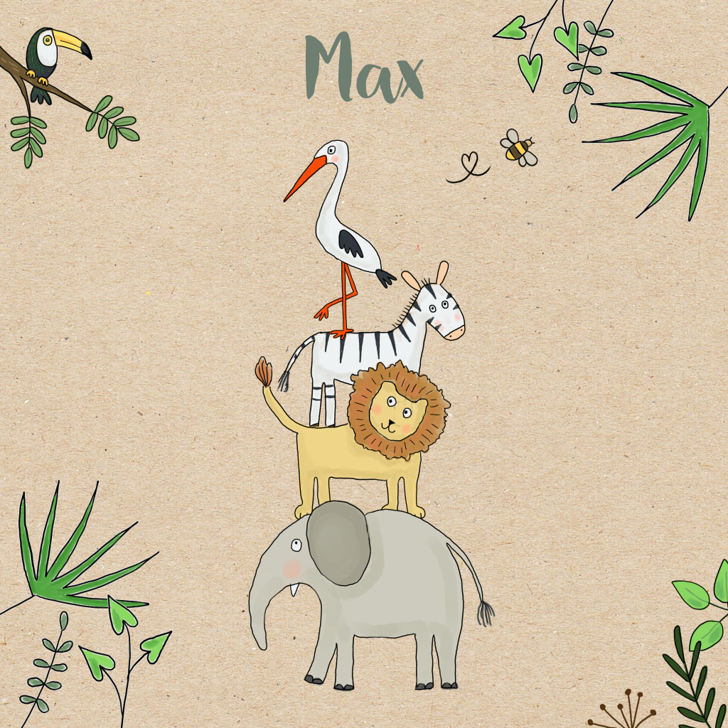 Leuk geboortekaartje voor een jongen met een stapel jungledieren op kraft. De teksten en lettertypes kunnen in de editor aangepast worden.