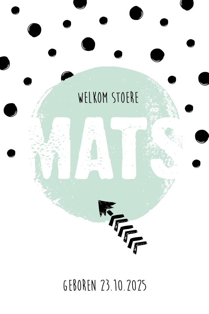 Krijg jij een jongetje? Gefeliciteerd! Met dit frisse geboortekaartje kan je je familie en vrienden laten weten dat de kleine is geboren. De confetti staat vrolijk bij de mintgroene stip met de naam van je jongen erin.