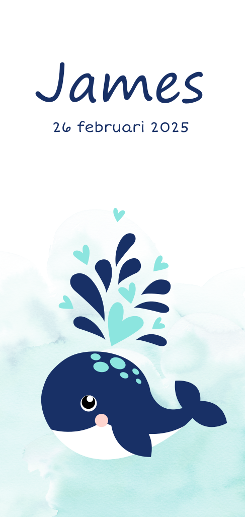 Krijg jij een jongen? Tussen onze dierenkaartjes kan je heel veel gave ontwerpen vinden. Dit geboortekaartje springt er uit door de leuke combinatie van een walvis in een zee van blauwe watercolour. De speelse hartjes maken het kaartje af.