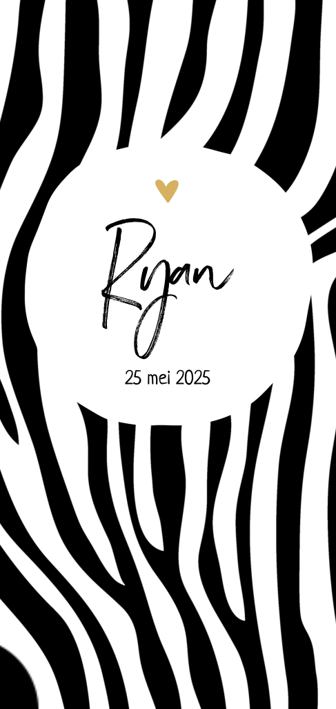 Hip jongens geboortekaartje met zebraprint en goudkleurig hartje.