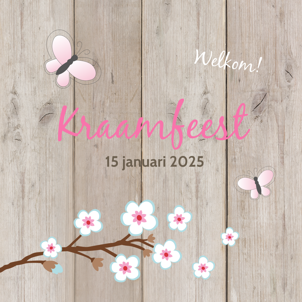 Een stoer kraamborrelkaartje met een houten achtergrond met daarvoor toffe illustraties van een bloementak en vlinders! Deze kaart heeft een natuurlijke uitstraling. Teksten pas je zelf eenvoudig aan. Iets voor jullie kraamfeest?