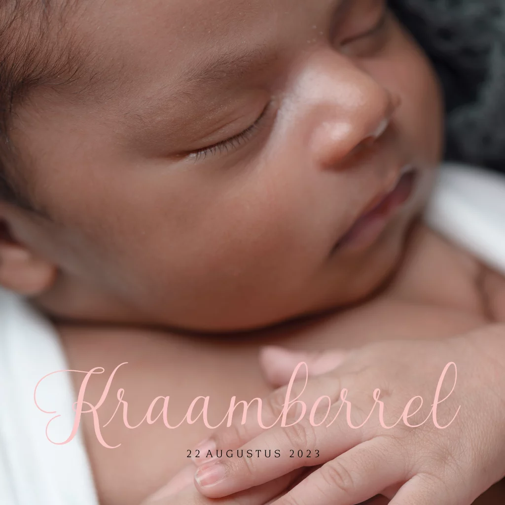 Een vierkant kraamborrelkaartje voor een meisje. Kies een mooie foto uit voor op de achtergrond en maak hem zelf af met eigen teksten en een van onze enveloppen!