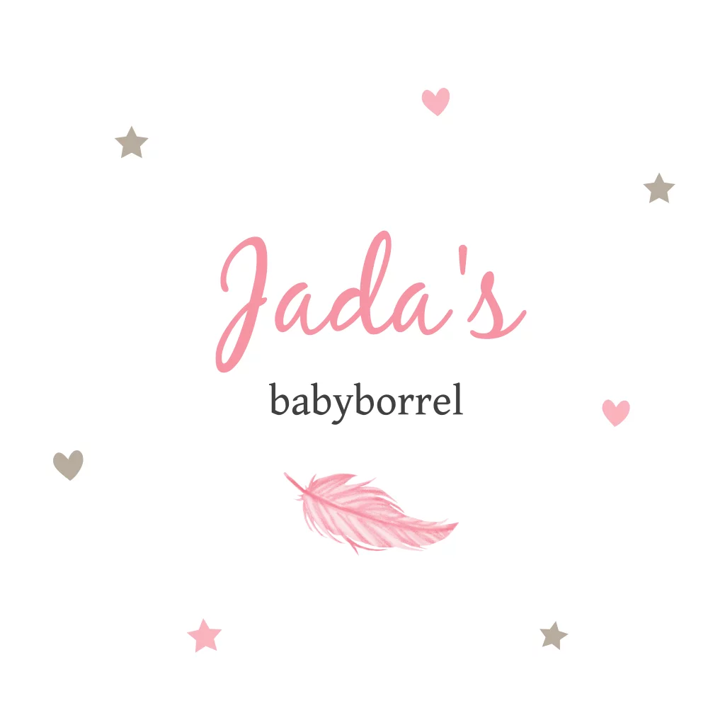 Lieve kraamborreluitnodiging voor een meisje met een veertje en lieve hartjes en sterretjes.