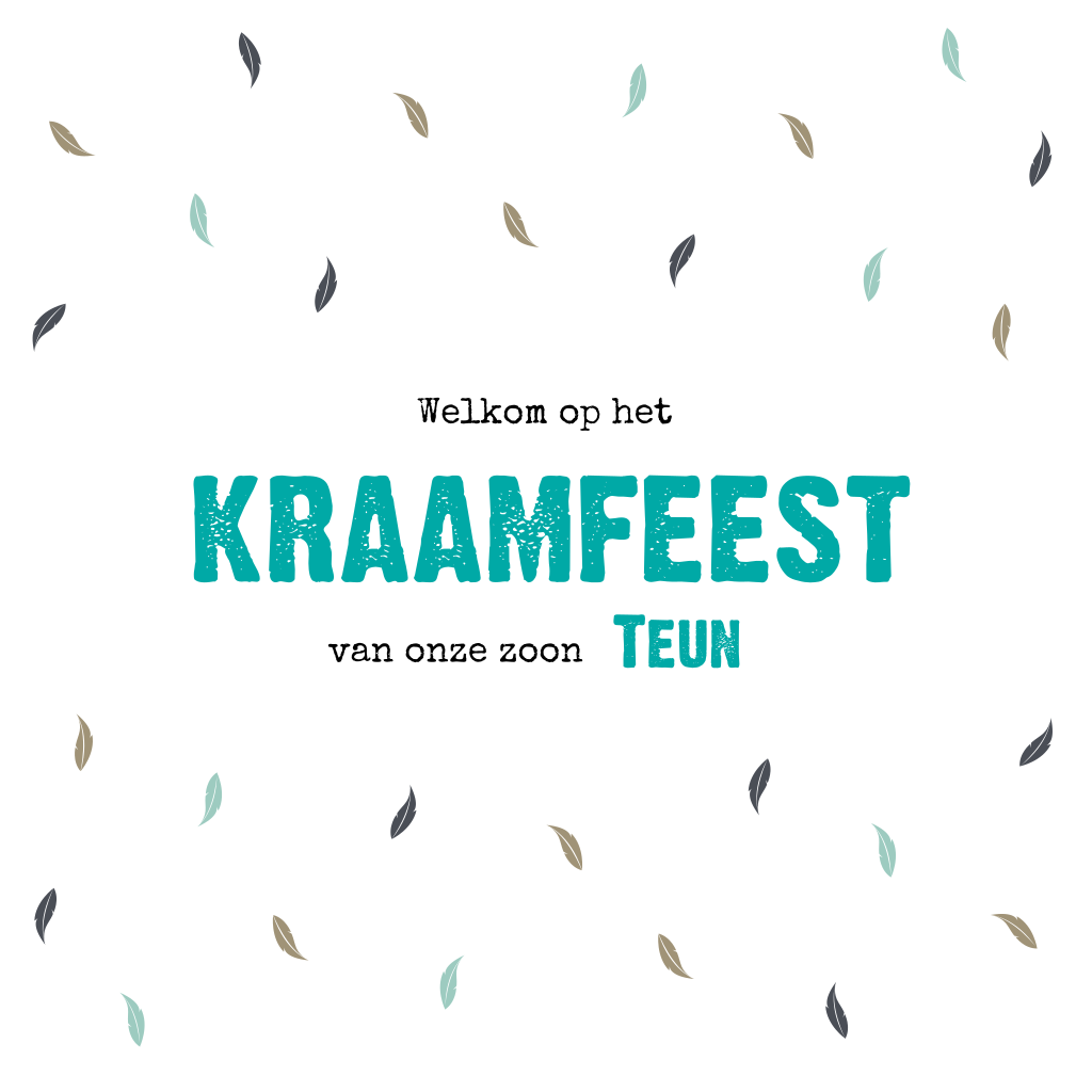 Houd jij een kraamfeest voor je zoon? Misschien is dit hippe babyborrelkaartje met veertjes iets voor jou! Hij heeft een speelse uitstraling. Je kunt er ook voor kiezen om een achtergrondkleur te doen en teksten en lettertypes zijn volledig naar wens aan te passen. Zo maak je er je eigen kaartje van!