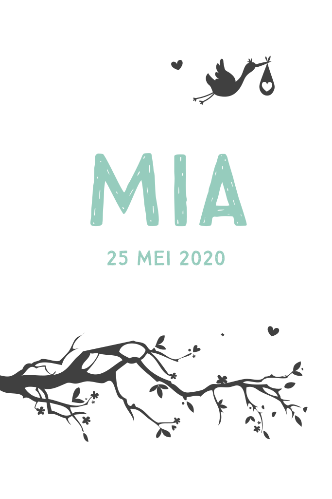 Dit simpele geboortekaartje is superleuk! Je ziet een ooievaar vliegen met een baby in de luier in zijn bek. De geboortekaart heeft ook een boomtak, wat het kaartje lekker vrolijk maakt.