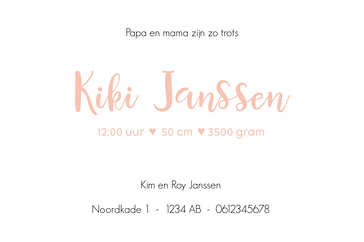 Een hip foto-geboortekaartje voor een dochter! Met een leuke foto van je kleine meisje maak je zelf een uniek geboortekaartje. Leuk is om de kleur van de naam te combineren met de kleuren in de foto. Maak hem zelf af!
