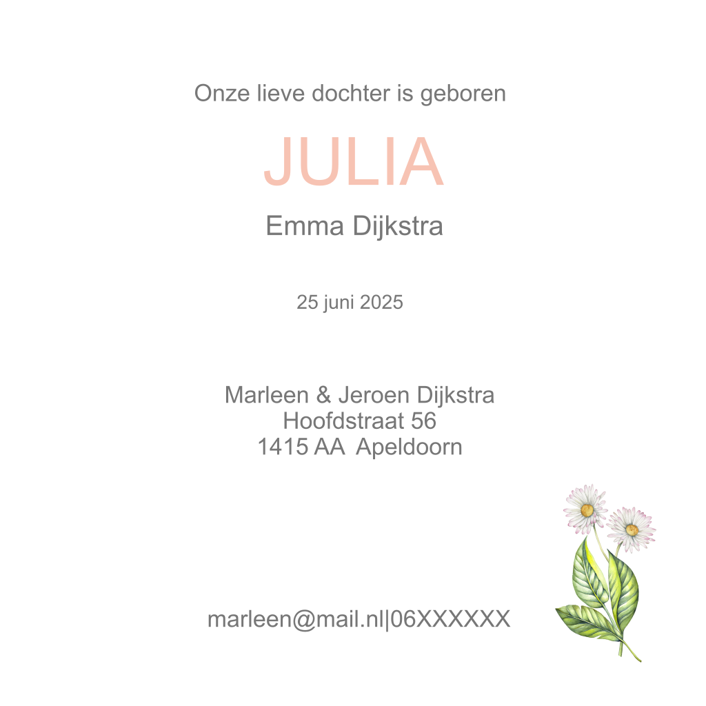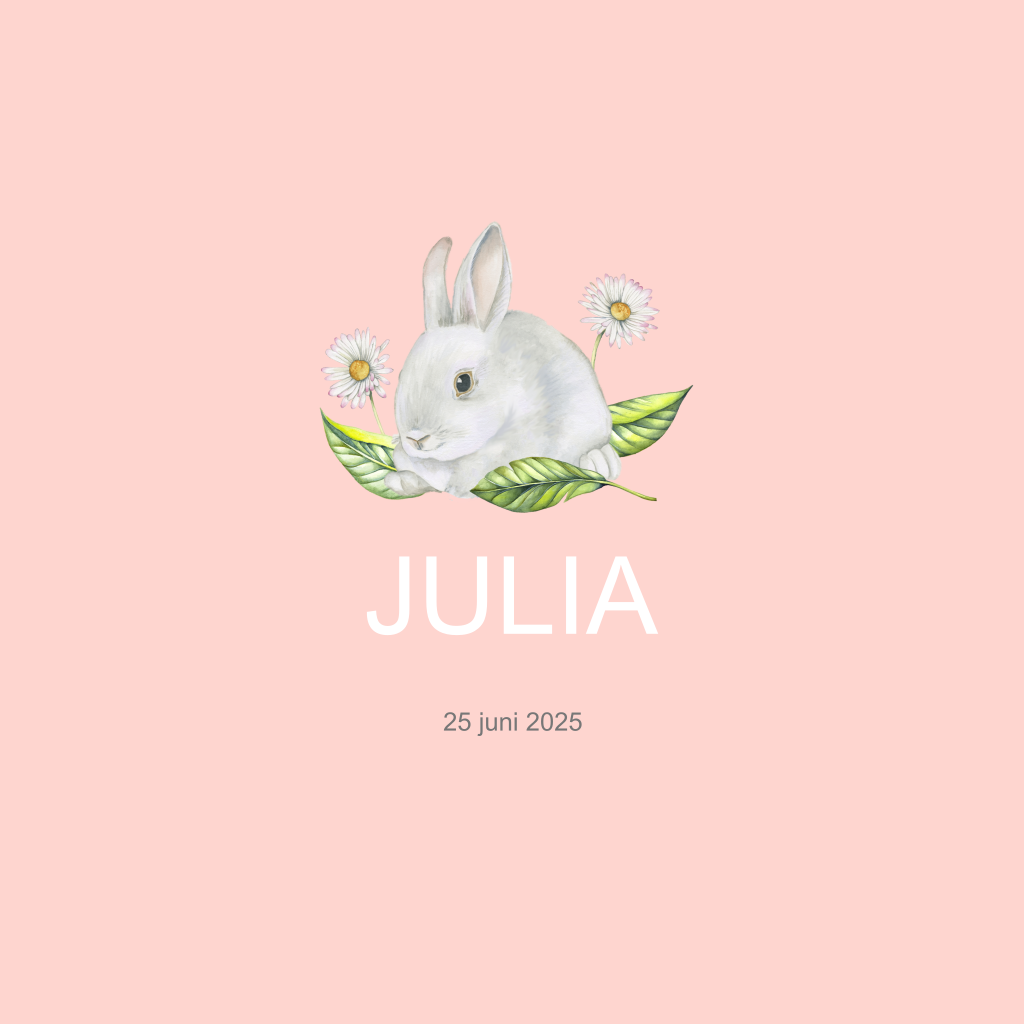 Een pluizig konijntje dat op groene blaadjes met bloemetjes ligt: wat lief! Met de roze achtergrond is dit schattige geboortekaartje echt leuk voor een meisje. Maak hem compleet met eigen teksten en een leuke envelop!