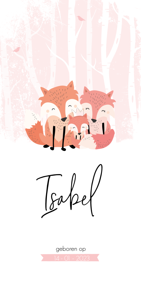 Lief, langwerpig geboortekaartje met drie vosjes voor een bos van roze watercolour en witte bomen. Leuk voor een meisje!
