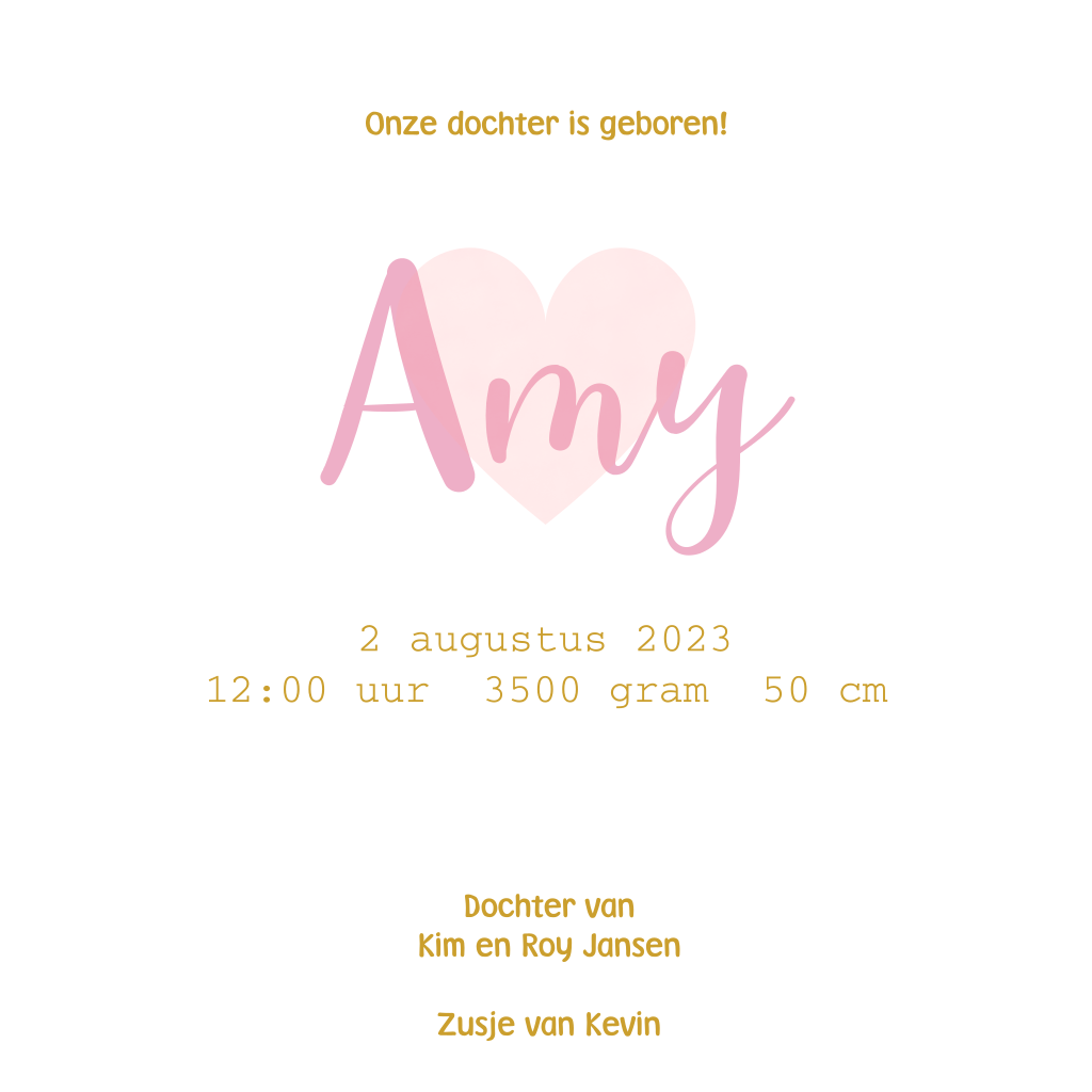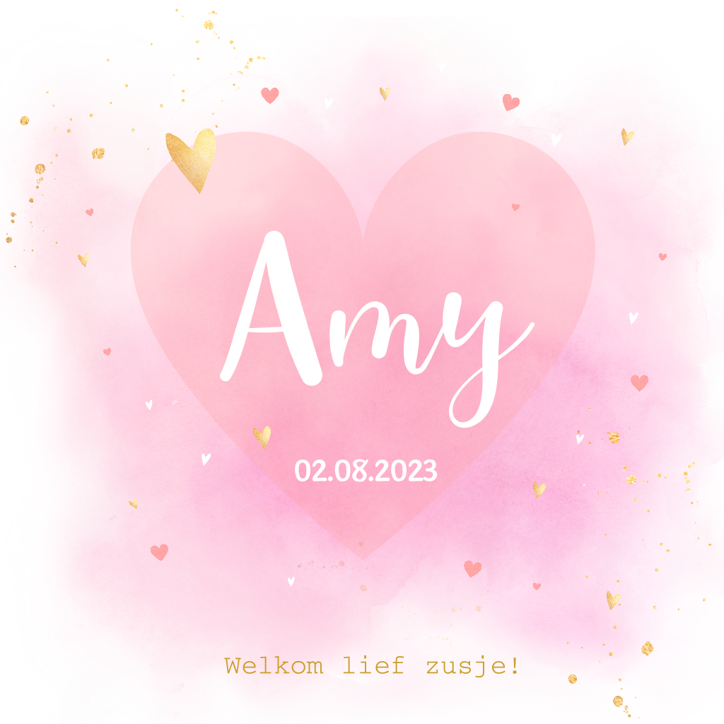 Een lief en hip babykaartje in prachtige roze tinten. Echt voor een meisje! Teksten en lettertypes kun je zelf aanpassen. De kleine hartjes in goudlook en wit met subtiel wat spettertjes maken hem helemaal af.