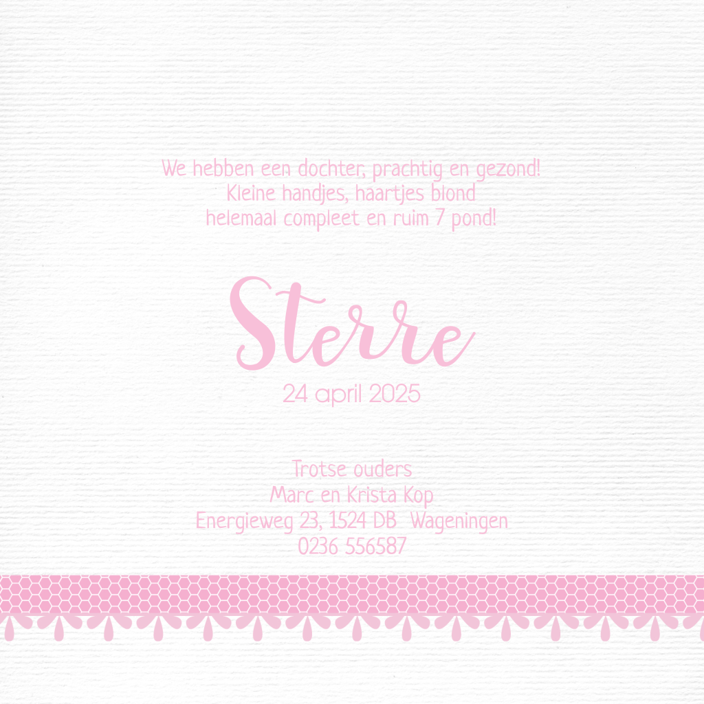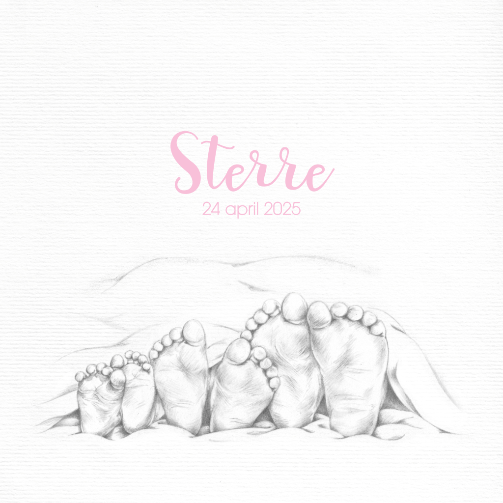 Een lief, getekend geboortekaartje met babyvoetjes. Leuk voor de geboorte-aankondiging van een meisje! Hoe heet jouw kleintje?