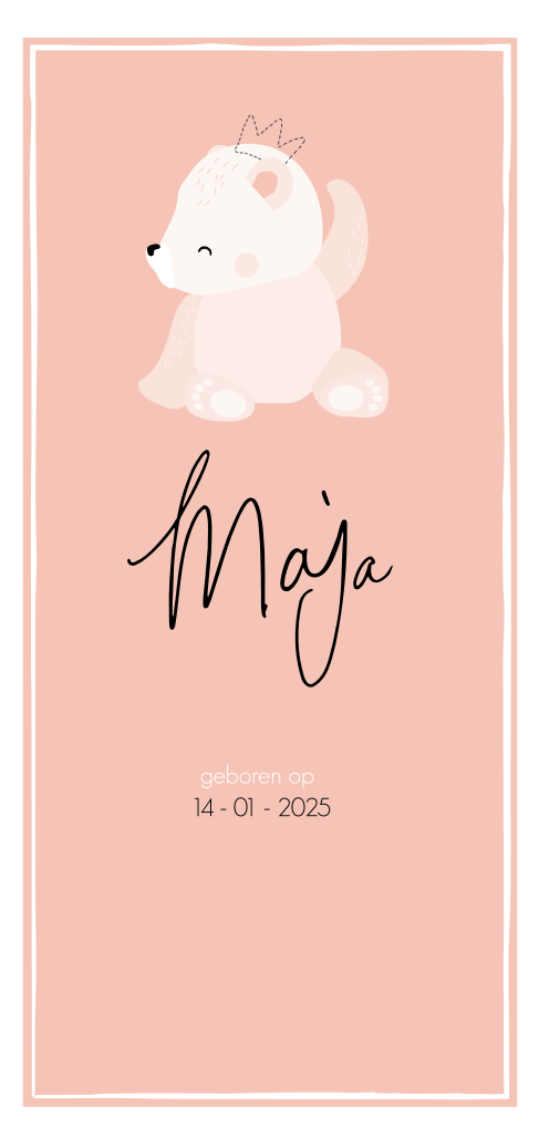 Wat een schattig geboortekaartje met een beertje met een kroontje op! Speciaal is ook de rand om de achtergrond in roze. Dit ontwerp voor een meisje is van Tante Kaartje. Maak hier je eigen kaartje van!