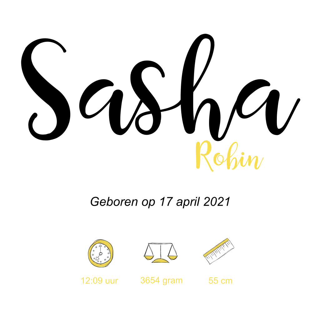 Wat een vrolijk geboortekaartje met een gele cirkel van watercolour en speelse, zwarte stippen! Dit kaartje is leuk voor een jongen. Je kunt teksten en lettertypes zelf aanpassen.