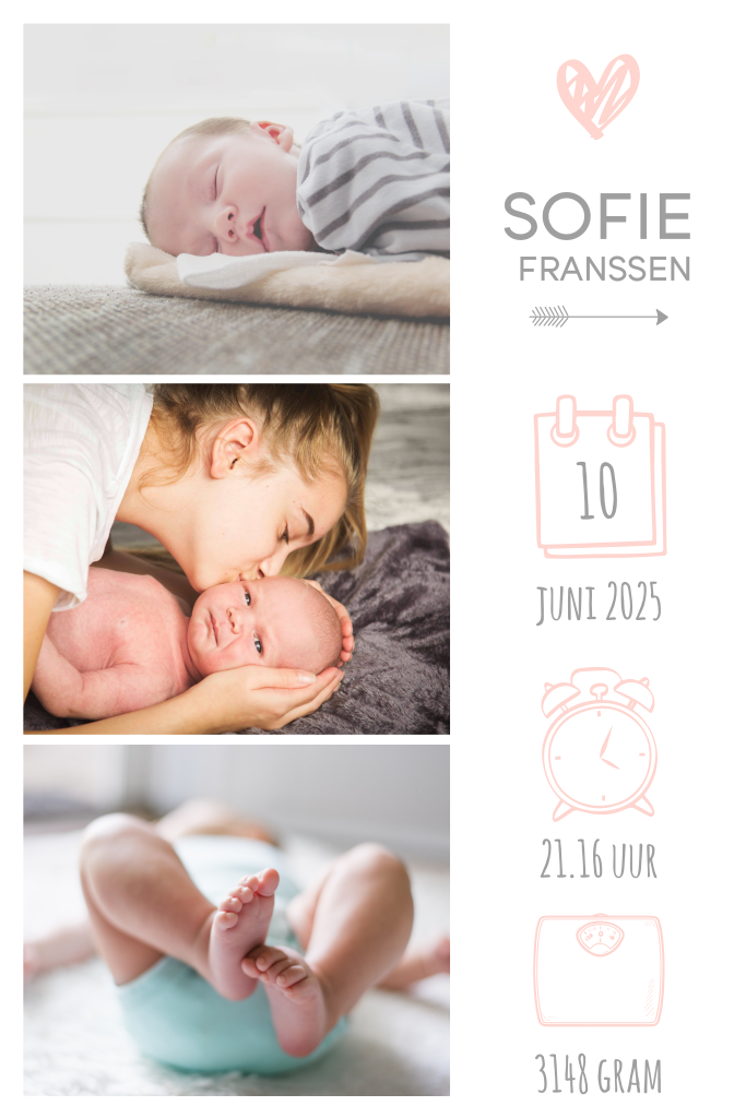 Een lief geboortekaartje voor een meisje met 3 fotokaders en hippe icoontjes in zachtroze. Schrijf je eigen tekst en combineer hem met een bijpassende envelop en sluitzegel!