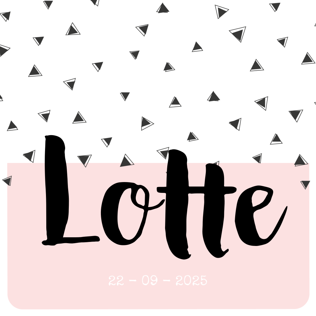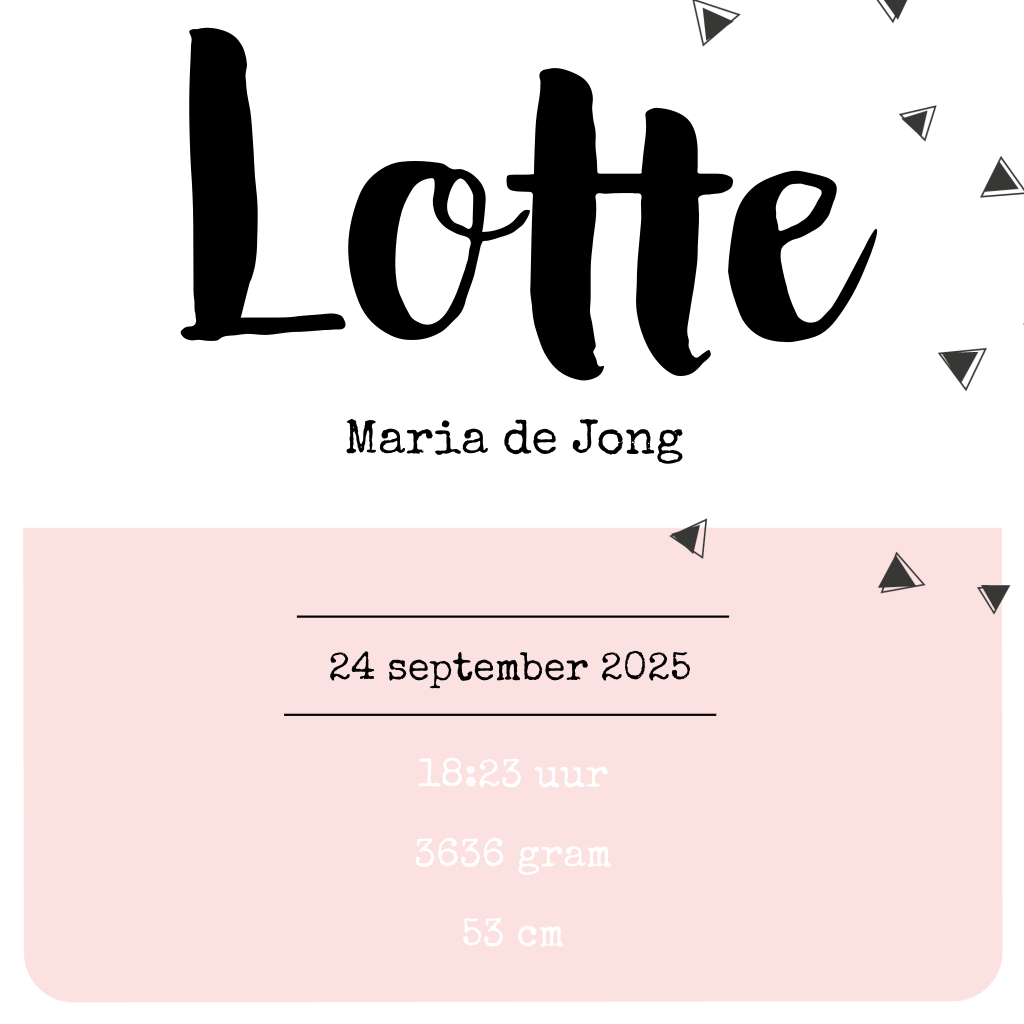 Allemaal driehoekjes op je geboortekaartje: wat trendy! Leuk voor een dochtertje. Het lichtroze kleurvlak kun je eventueel omkleuren. Maak het kaartje zelf af!