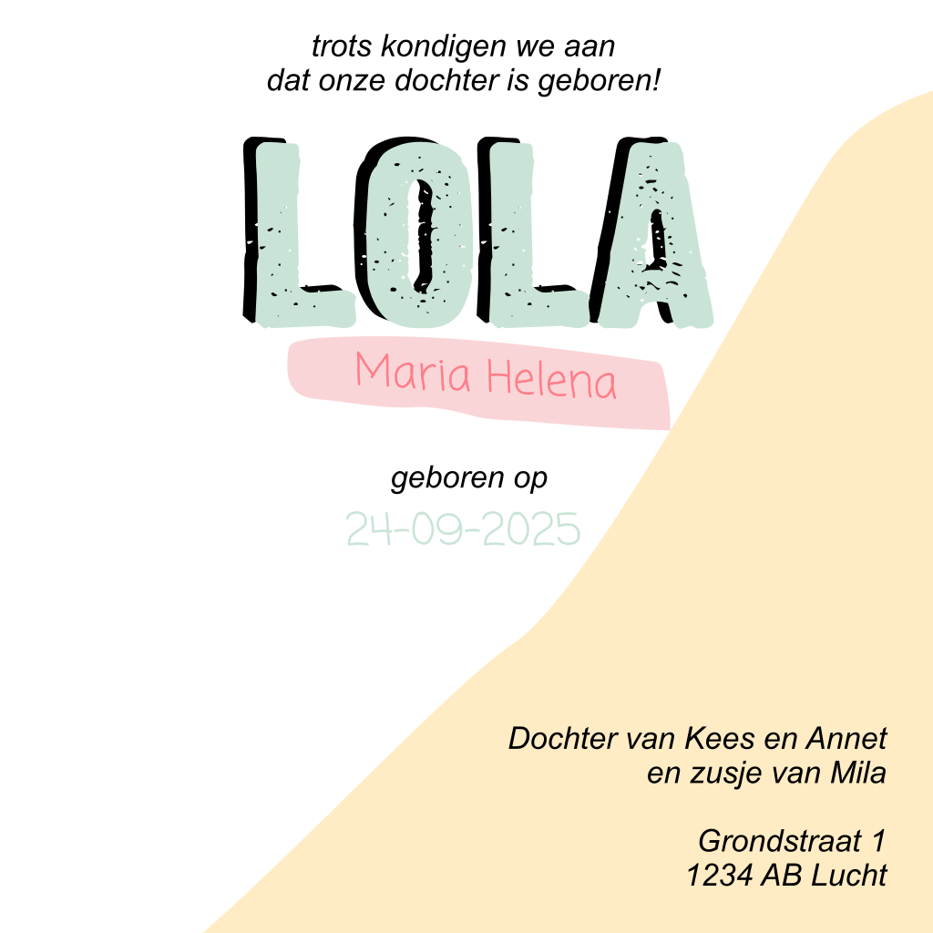 It's a girl! Dit hippe geboortekaartje heeft een stoer lettertype en is versierd met stipjes op een roze achtergrond. Tof is de kleurencombinatie van mintgroen, roze en geel. Iets voor jouw dochter?