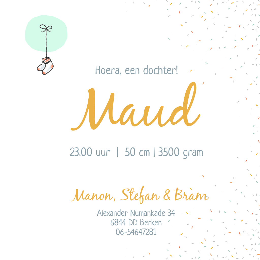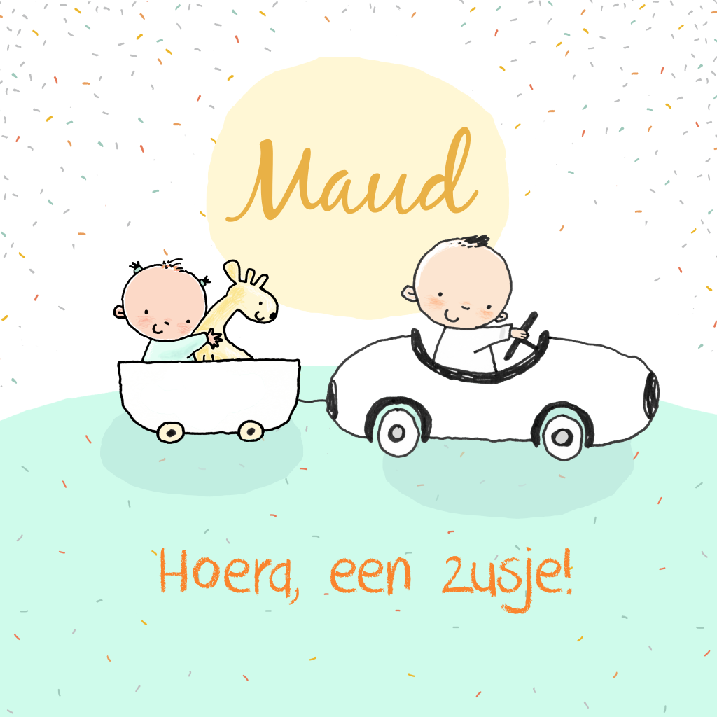 Hoera, een zusje! Dit schattige babykaartje van Pauline Oud heeft een tekening van een jongen in de auto met zijn babyzusje achterin in het karretje. De pasteltinten en kleurrijke confetti maken dit vrolijke, getekende kaartje helemaal af!