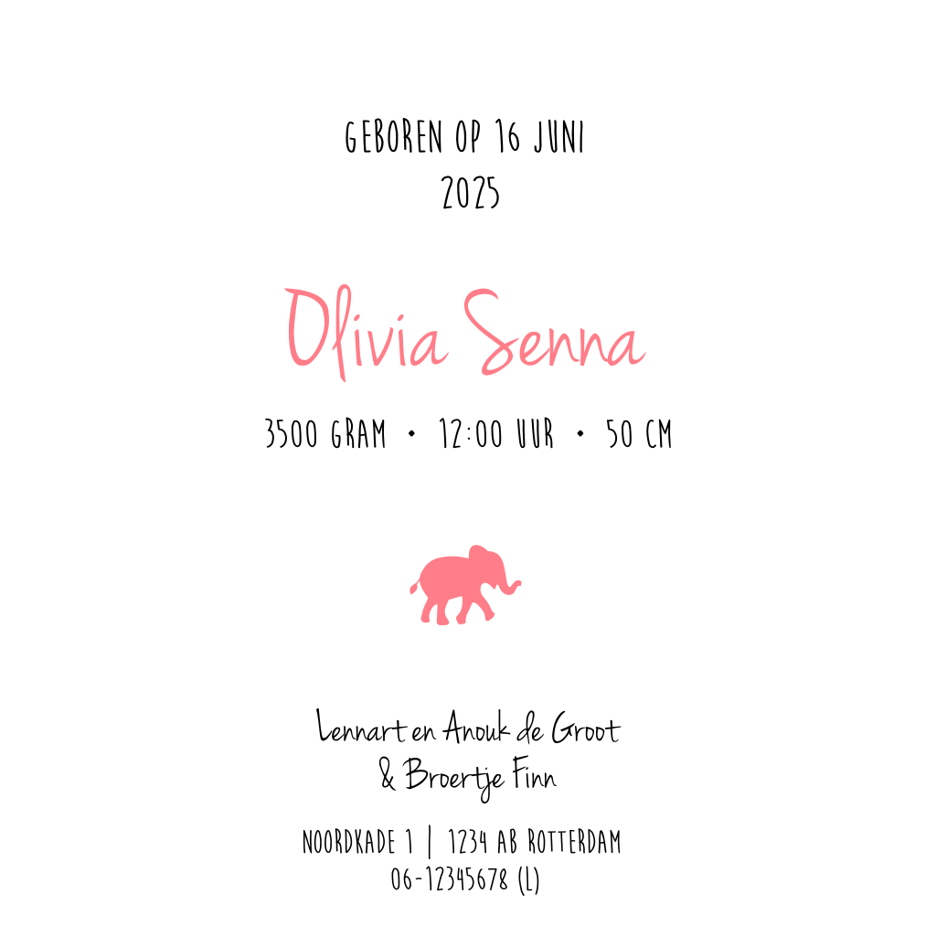 Een lief olifantje loopt in het gras naar een boom vol vlinders en hartjes: wat lief! Dit trendy silhouet-geboortekaartje is leuk voor een meisje. Teksten en lettertypes zijn naar wens aan te passen. Hoe heet jouw kleintje?