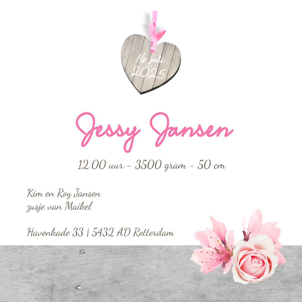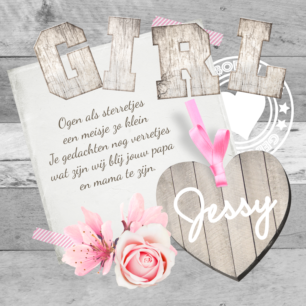 Dit stoere geboortekaartje voor een meisje heeft een romantische look. Het hartje met het strikje en de bloemetjes staan op het briefje waar je een mooi gedichtje op kunt schrijven. Op de achtergrond zie je nog een geboortestempel.